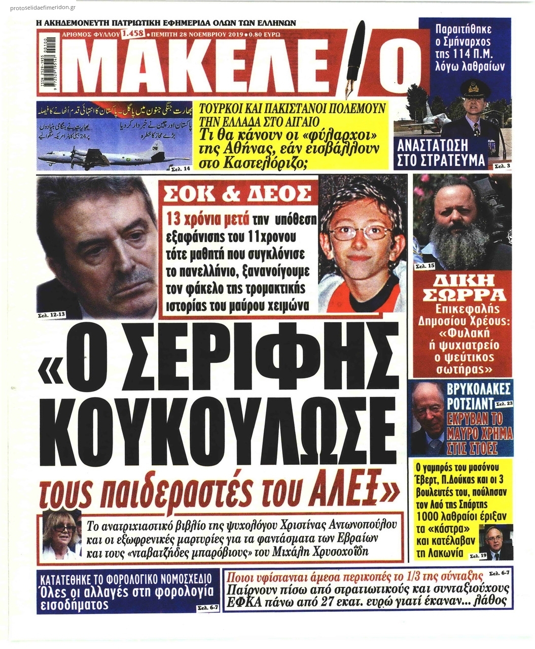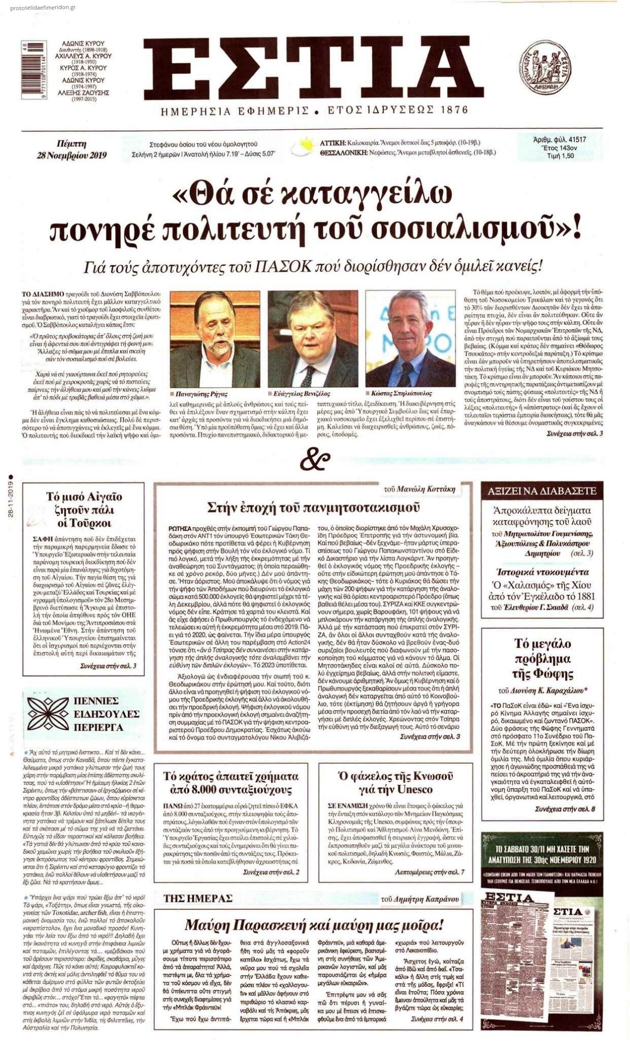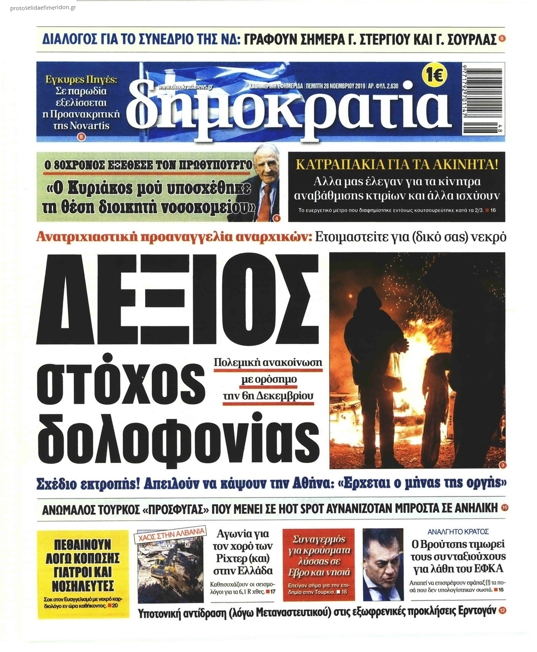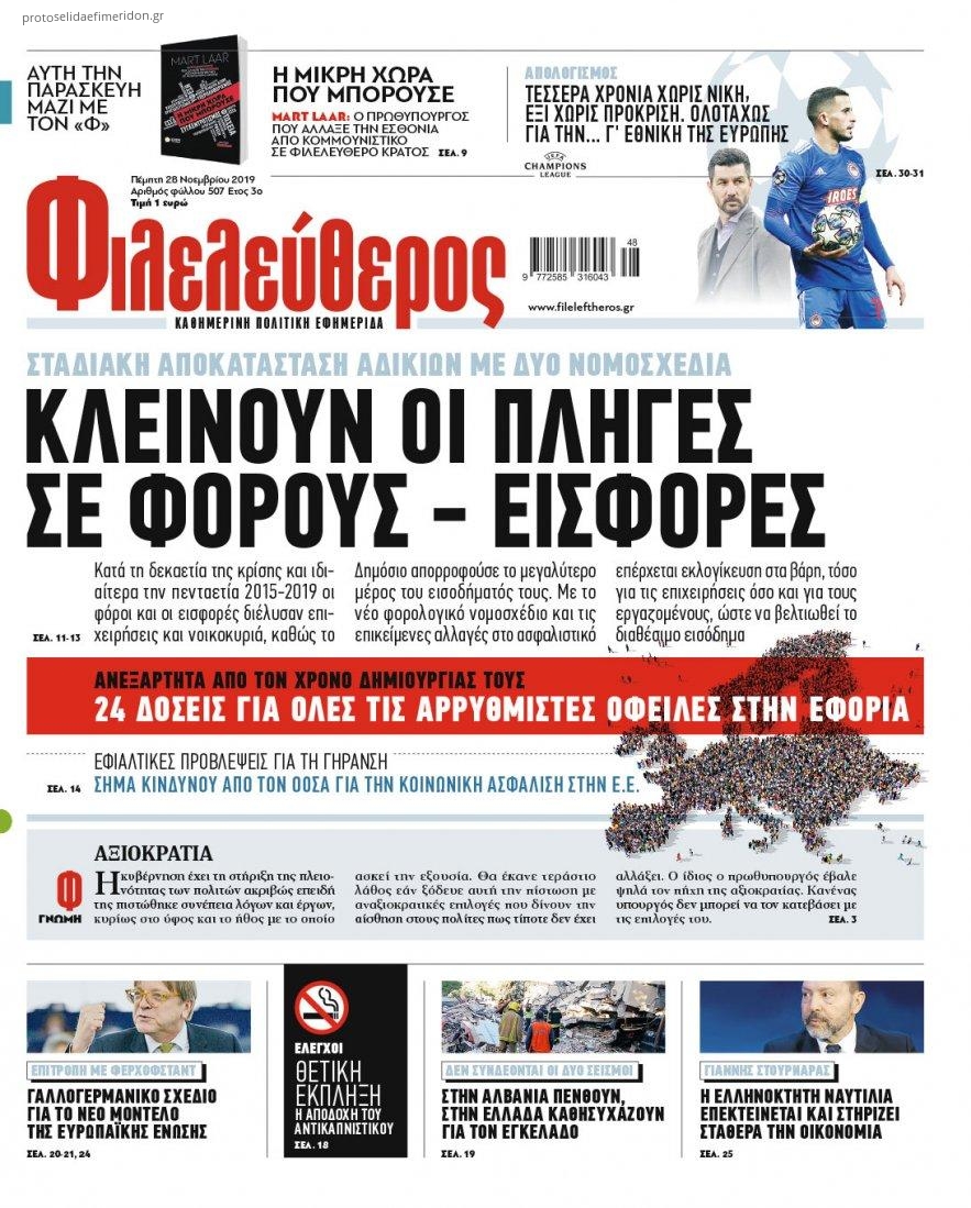NewsMEDIASLIDER Διαβάστε όλα τα πρωτοσέλιδα των πολιτικών εφημερίδων της Πέμπτης 28 Νοεμβρίου 2019 FacebookXEmailViberWhatsAppCopy URLΤυπώνω Διαβάστε όλα τα πρωτοσέλιδα των πολιτικών εφημερίδων της Πέμπτης 28 Νοεμβρίου. Πλήρης ενημέρωση με μια γρήγορη ματιά!