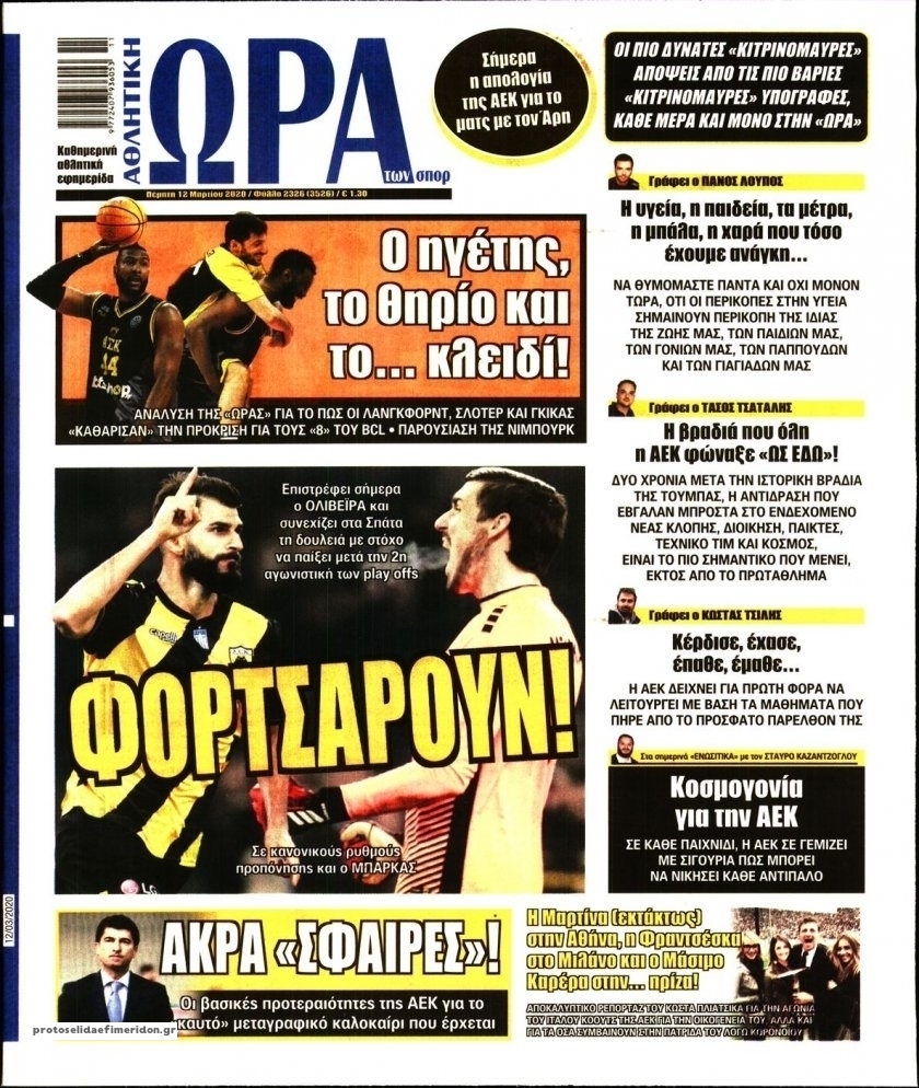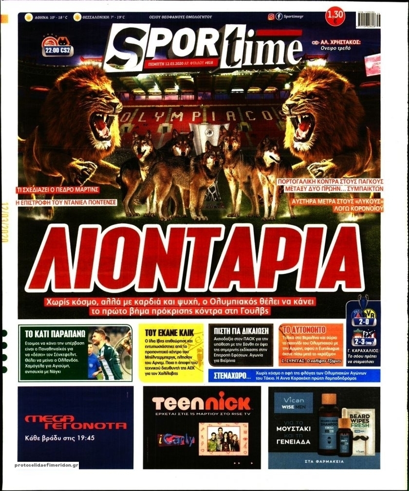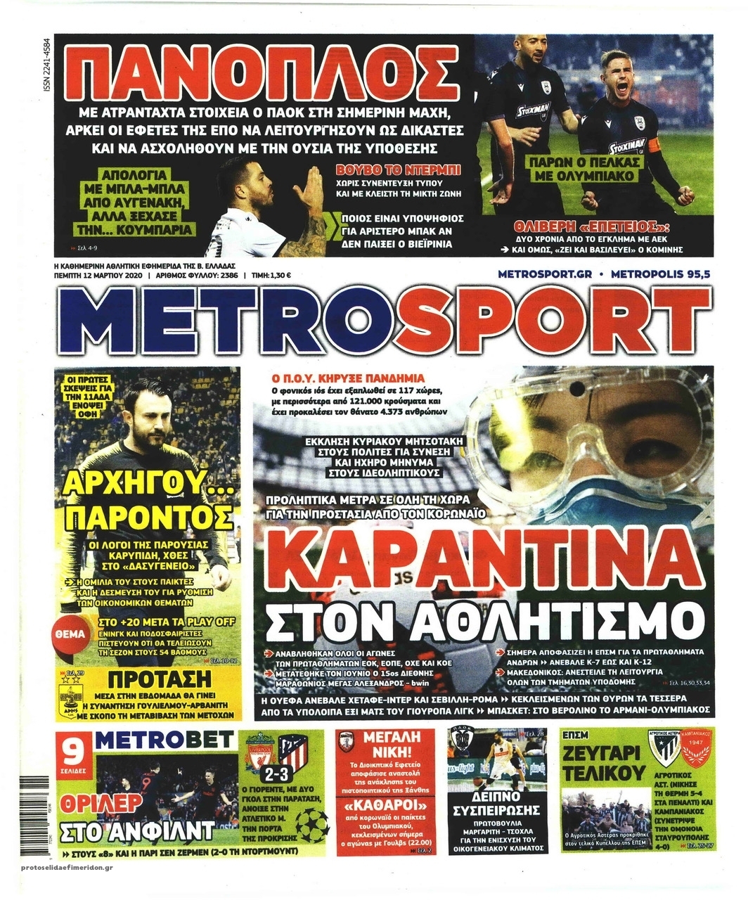 NewsMEDIA Διαβάστε όλα τα πρωτοσέλιδα των αθλητικών εφημερίδων της Πέμπτης 12 Μαρτίου 2020 FacebookTwitterEmailViberWhatsAppCopy URLΤυπώνω Διαβάστε όλα τα πρωτοσέλιδα των αθλητικών εφημερίδων της Πέμπτης 12 Μαρτίου. Πλήρης ενημέρωση με μια γρήγορη ματιά! ΔΙΑΒΑΣΤΕ ΕΠΙΣΗΣ: Διαβάστε όλα τα πρωτοσέλιδα των πολιτικών εφημερίδων της Πέμπτης