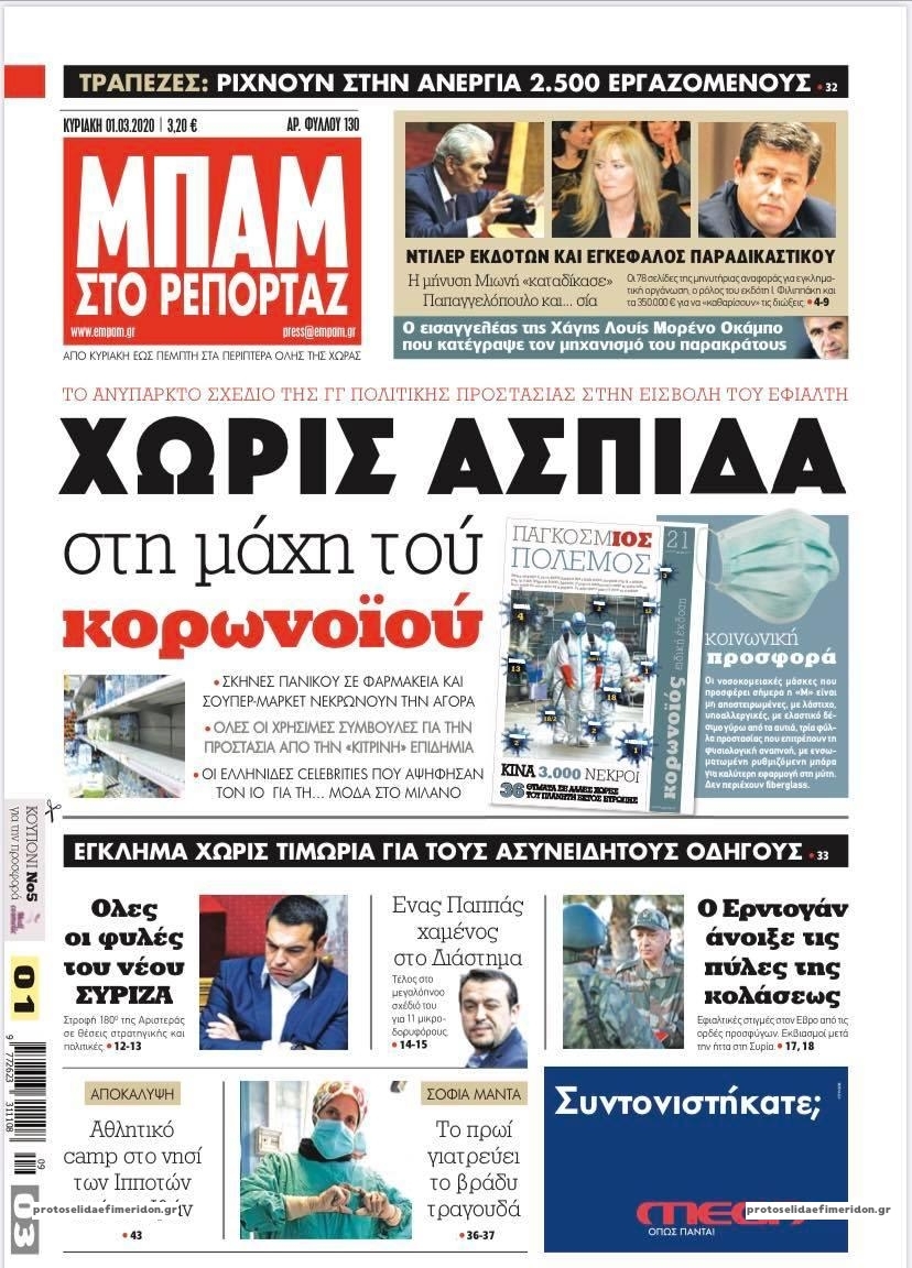 NewsMEDIA Διαβάστε όλα τα πρωτοσέλιδα των πολιτικών εφημερίδων της Κυριακής 1 Μαρτίου 2020 FacebookTwitterEmailViberWhatsAppCopy URLΤυπώνω Διαβάστε όλα τα πρωτοσέλιδα των πολιτικών εφημερίδων της Κυριακής 1ης Μαρτίου. Πλήρης ενημέρωση με μια γρήγορη ματιά!
