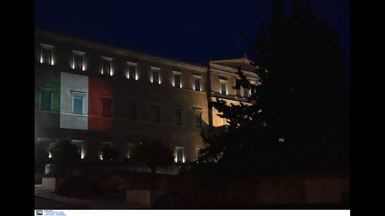 Οι τοίχοι της Βουλής των Ελλήνων φωτίστηκαν το βράδυ της Παρασκευής με τα χρώματα της ιταλικής σημαίας, σε ένδειξη αλληλεγγύης και συμπαράστασης για τα θύματα του κορωνοϊού.