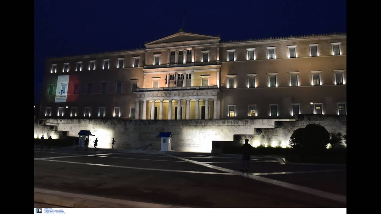 Οι τοίχοι της Βουλής των Ελλήνων φωτίστηκαν το βράδυ της Παρασκευής με τα χρώματα της ιταλικής σημαίας, σε ένδειξη αλληλεγγύης και συμπαράστασης για τα θύματα του κορωνοϊού.