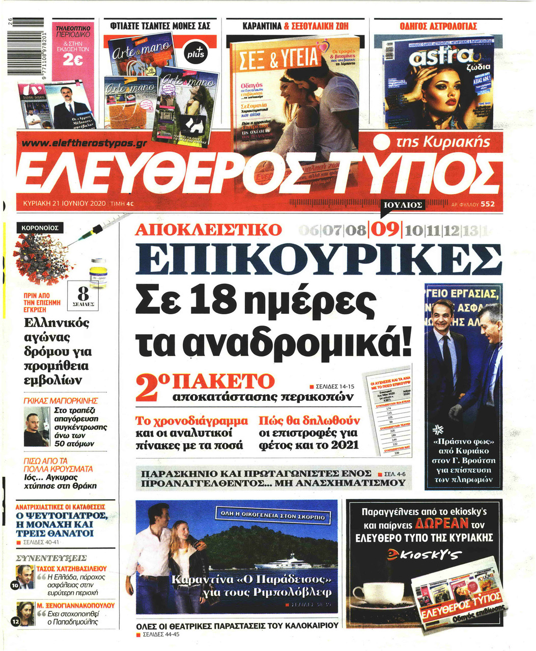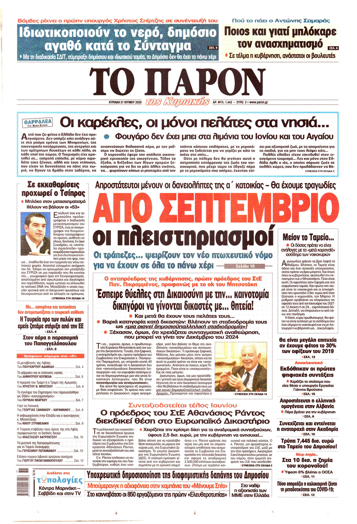 NewsMEDIASLIDER Διαβάστε όλα τα πρωτοσέλιδα των πολιτικών εφημερίδων της Κυριακής 21 Ιουνίου 2020 FacebookTwitterEmailViberWhatsAppCopy URLΤυπώνω Διαβάστε όλα τα πρωτοσέλιδα των πολιτικών εφημερίδων της Κυριακής 21 Ιουνίου. Πλήρης ενημέρωση με μια γρήγορη ματιά!