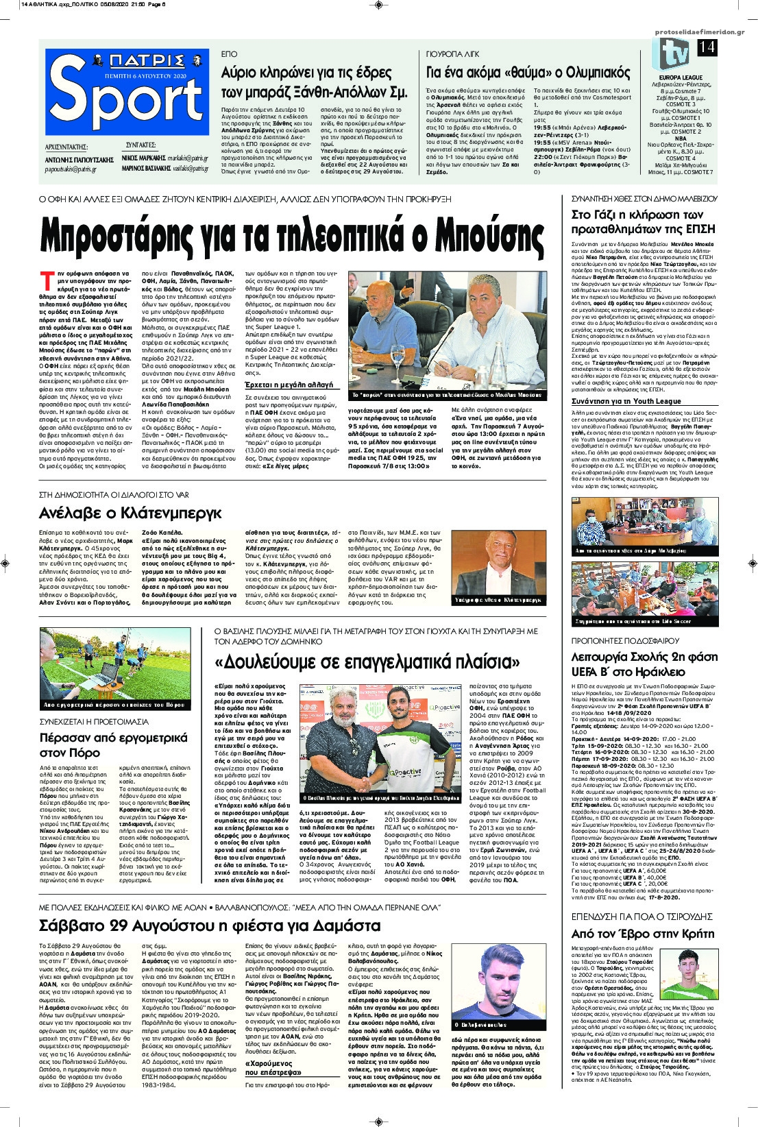 NewsMEDIA Διαβάστε όλα τα πρωτοσέλιδα των αθλητικών εφημερίδων της Πέμπτης 6 Αυγούστου 2020 FacebookXEmailViberWhatsAppCopy URLΤυπώνω Διαβάστε όλα τα πρωτοσέλιδα των αθλητικών εφημερίδων της Πέμπτης 6 Αυγούστου. Πλήρης ενημέρωση με μια γρήγορη ματιά!