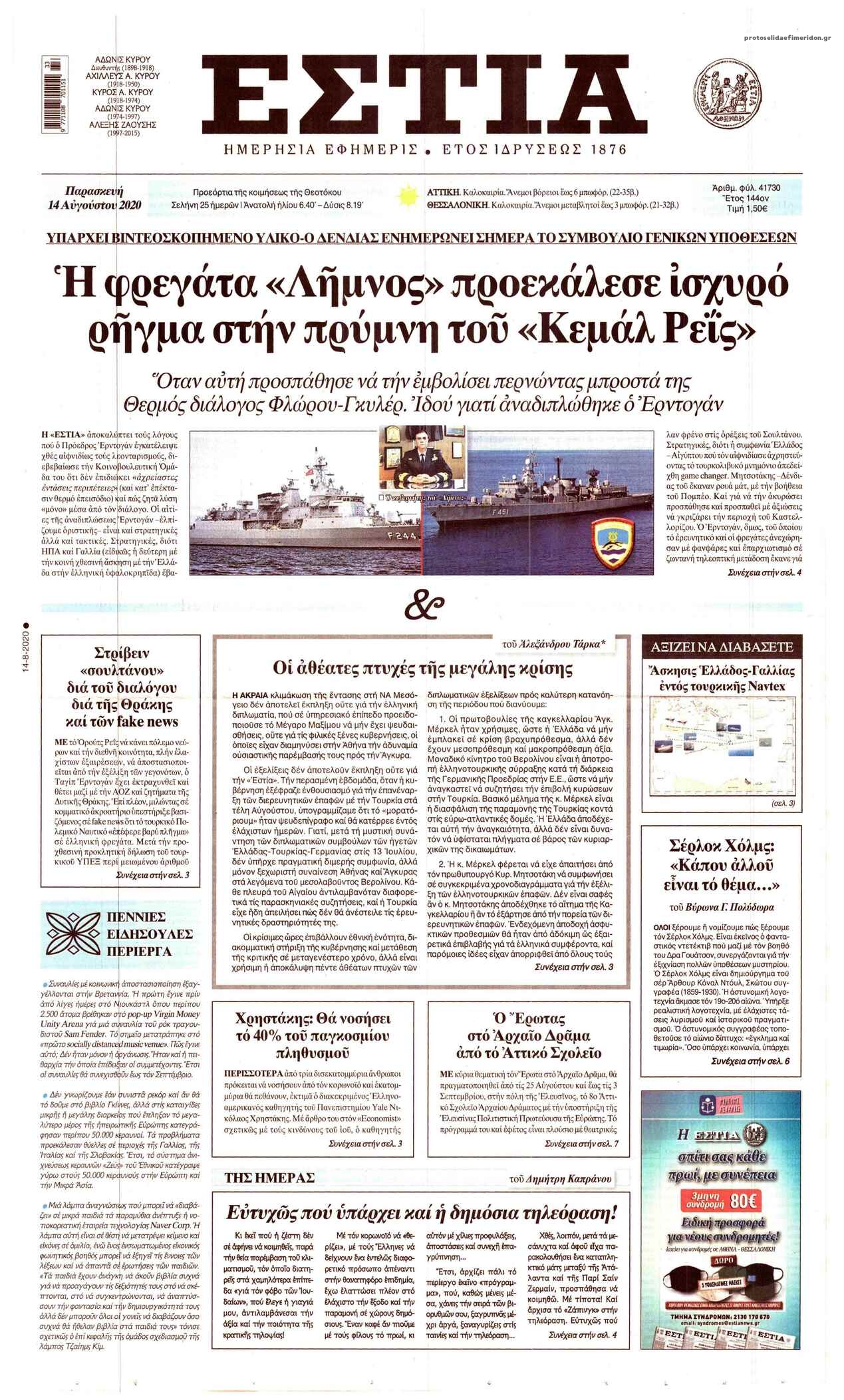 NewsMEDIA Διαβάστε όλα τα πρωτοσέλιδα των πολιτικών εφημερίδων της Παρασκευής 14 Αυγούστου 2020 FacebookXEmailViberWhatsAppCopy URLΤυπώνω Διαβάστε όλα τα πρωτοσέλιδα των πολιτικών εφημερίδων της Παρασκευής 14 Αυγούστου. Πλήρης ενημέρωση με μια γρήγορη ματιά!