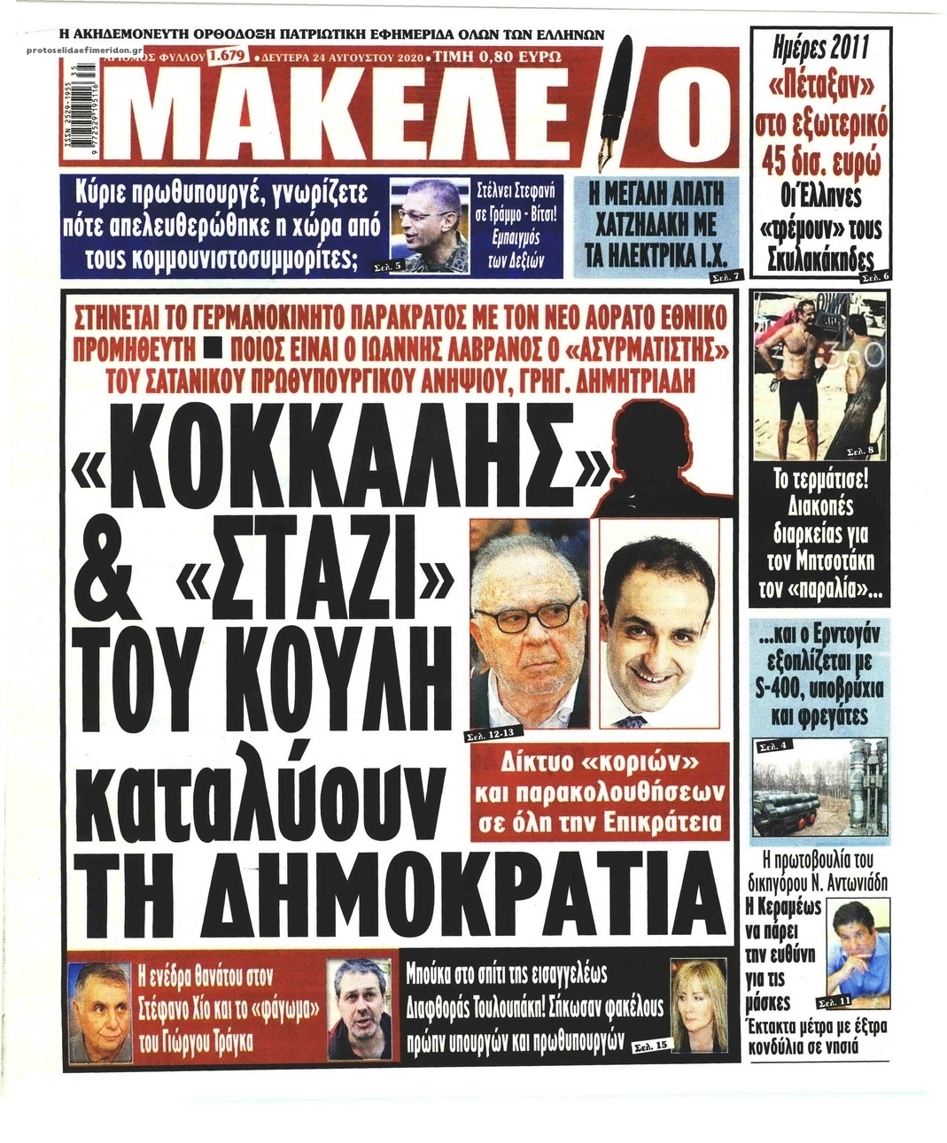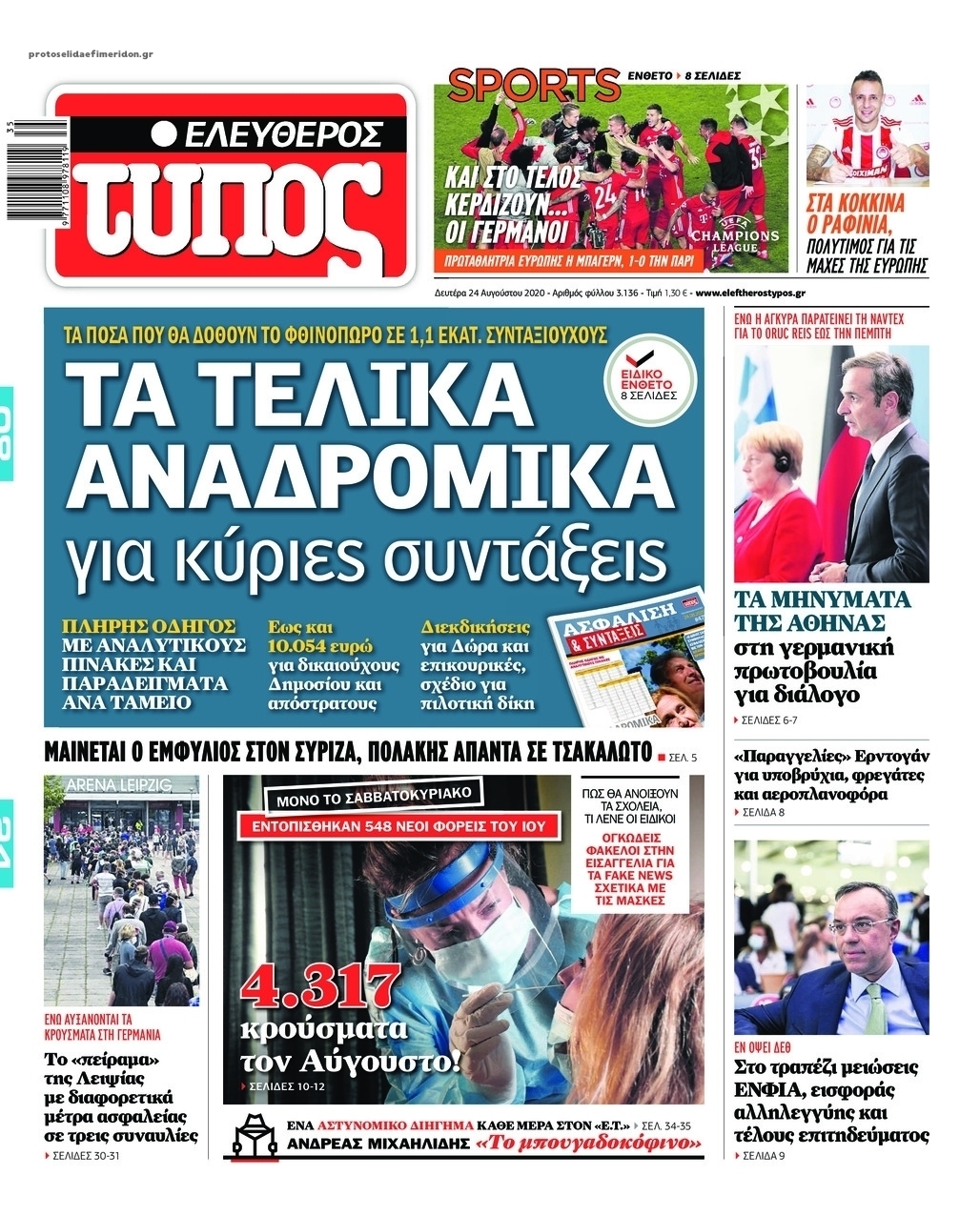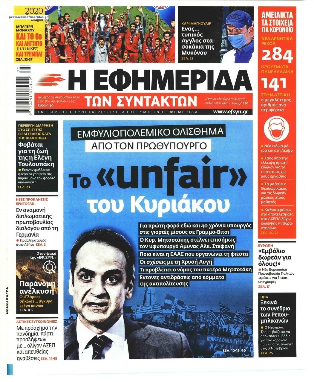 NewsMEDIA Διαβάστε όλα τα πρωτοσέλιδα των πολιτικών εφημερίδων της Δευτέρας 24 Αυγούστου 2020 FacebookTwitterEmailViberWhatsAppCopy URLΤυπώνω Διαβάστε όλα τα πρωτοσέλιδα των πολιτικών εφημερίδων της Δευτέρας 24 Αυγούστου. Πλήρης ενημέρωση με μια γρήγορη ματιά!