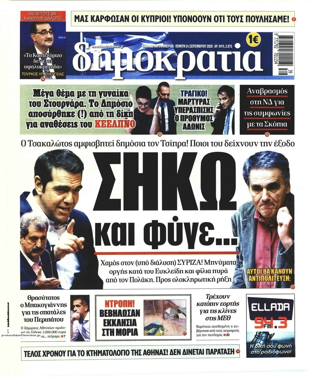 NewsMEDIASLIDER Διαβάστε όλα τα πρωτοσέλιδα των πολιτικών εφημερίδων της Πέμπτης 24 Σεπτεμβρίου 2020 FacebookTwitterEmailViberWhatsAppCopy URLΤυπώνω Διαβάστε όλα τα πρωτοσέλιδα των πολιτικών εφημερίδων της Πέμπτης 24 Σεπτεμβρίου. Πλήρης ενημέρωση με μια γρήγορη ματιά!
