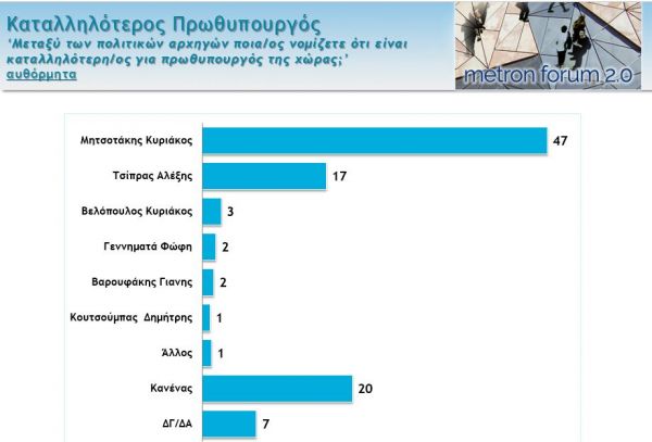 Καταλληλότερος για πρωθυπουργός προκρίνεται ο Κ. Μητσοτάκης με 47%, 30 μονάδες διαφορά από τον Αλέξη Τσίπρα (17%). Κανένας από τους πολιτικούς αρχηγούς λένε 2 στους 10 πολίτες.