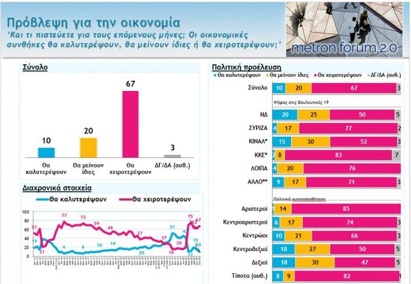 Σε ό,τι αφορά την πρόβλεψη για την οικονομία τους επόμενους μήνες, το 67%, δηλαδή σχεδόν 7 στους 10 περιμένουν χειρότερες ημέρες ενώ το 10% μόλις λέει ότι θα καλυτερέψουν.