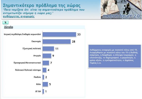 Σημαντικότερο πρόβλημα για 1 στους 3 πολίτες (33%) είναι η ιατρική περίθαλψη – Επιδημία του κορωνοϊού ενώ το 28% δηλώνει ότι είναι η οικονομία.
