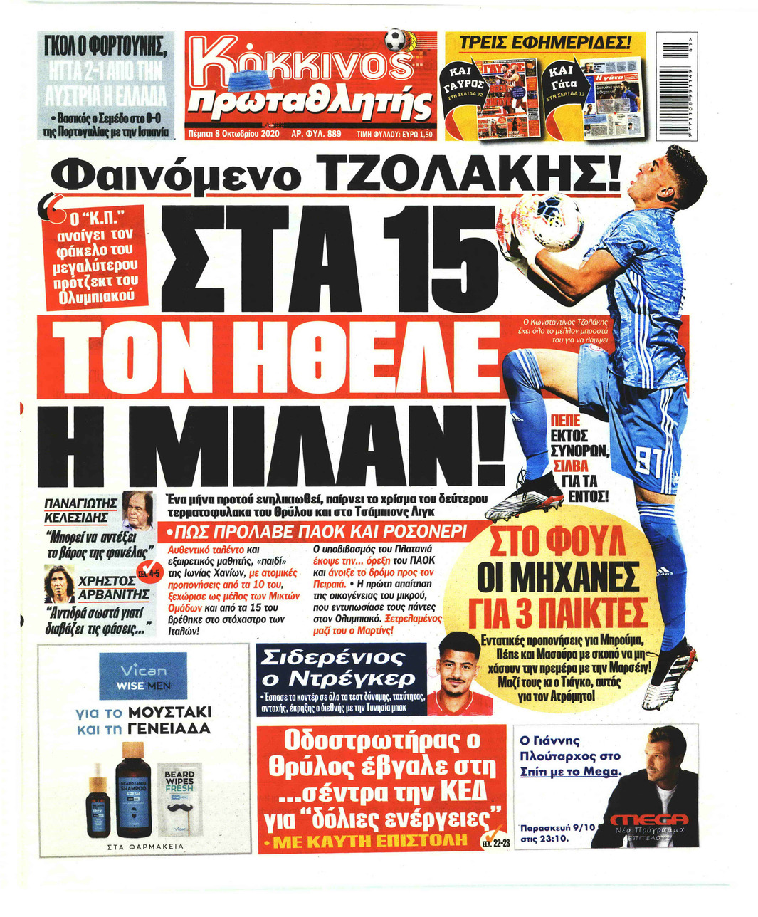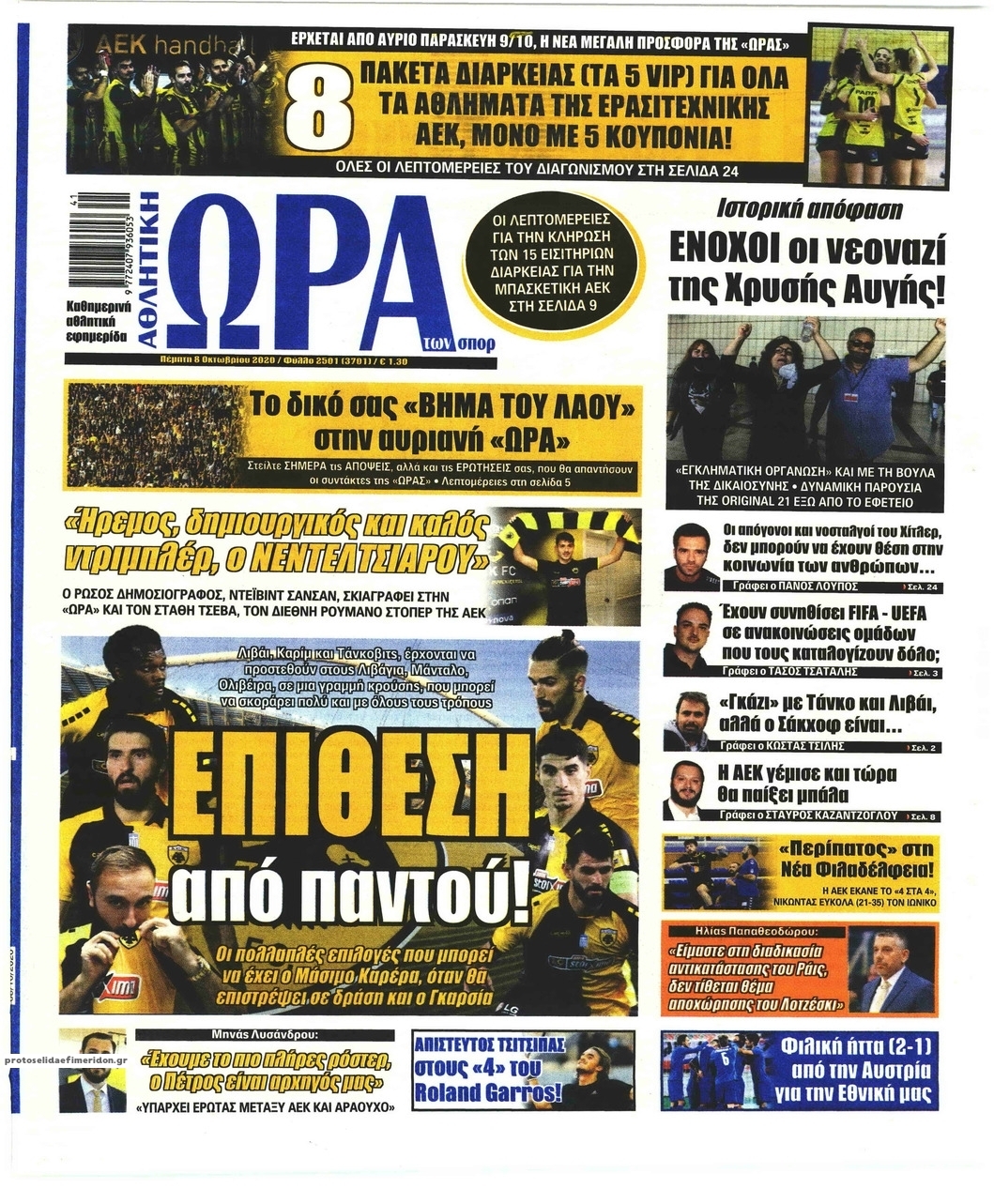 NewsMEDIA Διαβάστε όλα τα πρωτοσέλιδα των αθλητικών εφημερίδων της Πέμπτης 8 Οκτωβρίου 2020 FacebookTwitterEmailViberWhatsAppCopy URLΤυπώνω Διαβάστε όλα τα πρωτοσέλιδα των αθλητικών εφημερίδων της Πέμπτης 8 Οκτωβρίου. Πλήρης ενημέρωση με μια γρήγορη ματιά!