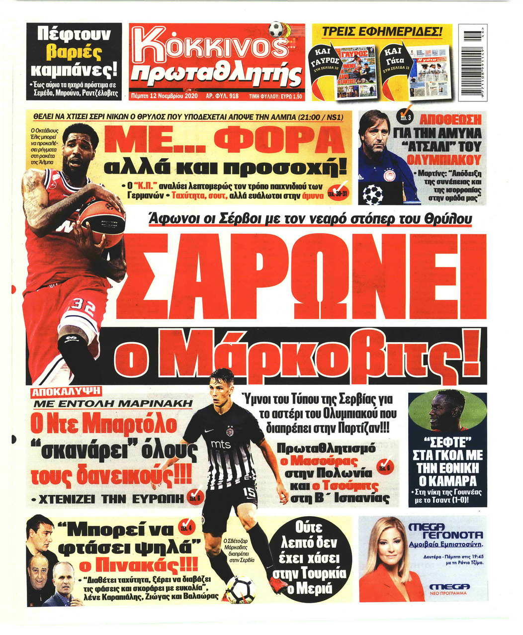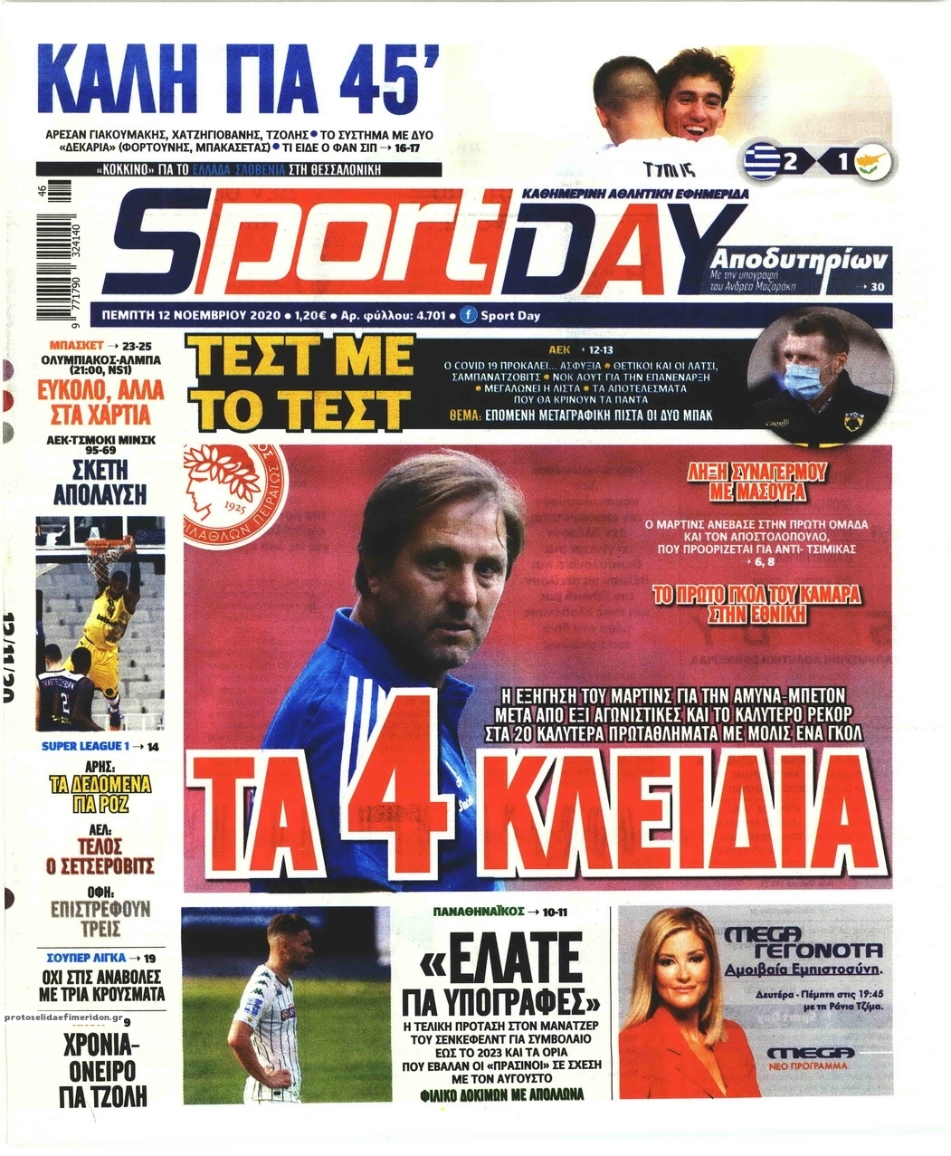 NewsMEDIA Διαβάστε όλα τα πρωτοσέλιδα των αθλητικών εφημερίδων της Πέμπτης 12 Νοεμβρίου 2020 FacebookTwitterEmailViberWhatsAppCopy URLΤυπώνω Διαβάστε όλα τα πρωτοσέλιδα των αθλητικών εφημερίδων της Πέμπτης 12 Νοεμβρίου. Πλήρης ενημέρωση με μια γρήγορη ματιά!
