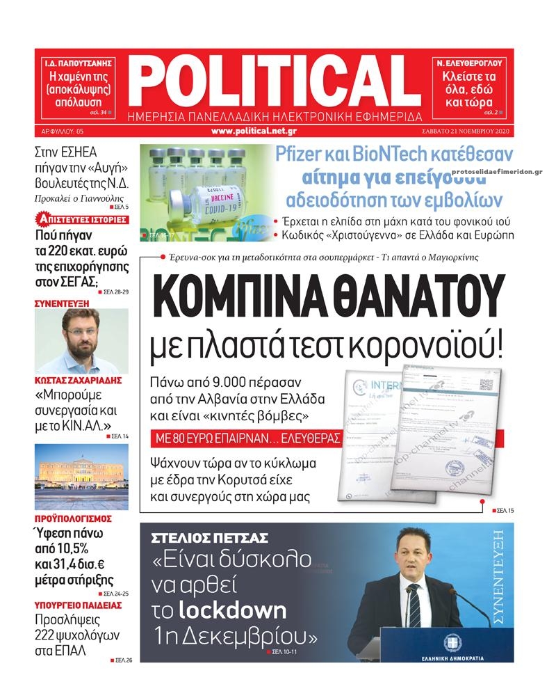 Διαβάστε όλα τα πρωτοσέλιδα των πολιτικών εφημερίδων του Σαββάτου 21 Νοεμβρίου. Πλήρης ενημέρωση με μια γρήγορη ματιά!