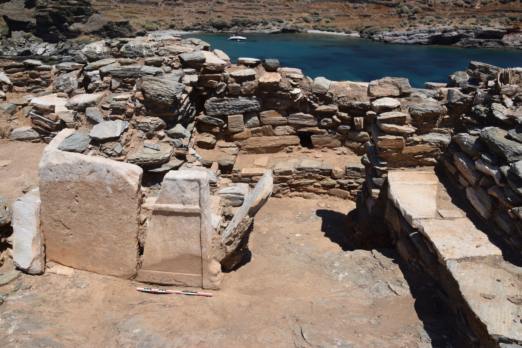Στο αρχαίο ιερό που εντοπίστηκε το 2019, οι έρευνες περιορίστηκαν στην ανασκαφή αδιατάρακτων στρωμάτων με σκοπό, αφενός τη χρονολόγηση της κατασκευής του μνημειώδους αναλήμματος και αφετέρου την καλύτερη κατανόηση της φύσης της λατρείας. Όπως και στην περσινή έρευνα συλλέχθηκε εξαιρετικής ποιότητας κεραμεική των γεωμετρικών και αρχαϊκών χρόνων. Τα σχήματα είναι κυρίως μικρά κλειστά, όπως υδρίες, οινοχόες και πρόχοι, ενώ δεν λείπουν τα μικρογραφικά. Στα ευρήματα συγκαταλέγονται λίγα πήλινα ειδώλια, κυρίως γυναικείων μορφών και ορισμένα χάλκινα αναθήματα, όπως μικρογραφικές πόρπες και άλλα κοσμήματα. Τα ευρήματα αυτά παραπέμπουν μάλλον σε κάποια γυναικεία θεότητα. Επιπλέον οδηγούν στο συμπέρασμα ότι το ανάλημμα κτίστηκε κατά τους κλασικούς χρόνους προκειμένου να δημιουργηθεί άνδηρο για την κατασκευή ναού, από τον οποίο σώζονται μόνον κάποια λαξεύματα στο ριζιμιό βράχο καθώς στην περιοχή αναπτύχθηκε ο πρωτοβυζαντινός οικισμός (στην τελευταία φάση χρήσης του χώρου ανήκει ακέραιος λύχνος). Στα Ανατολικά υπήρχε μνημειώδης βωμός λαξευμένος στο φυσικό βράχο, σήμερα πολύ διαβρωμένος.