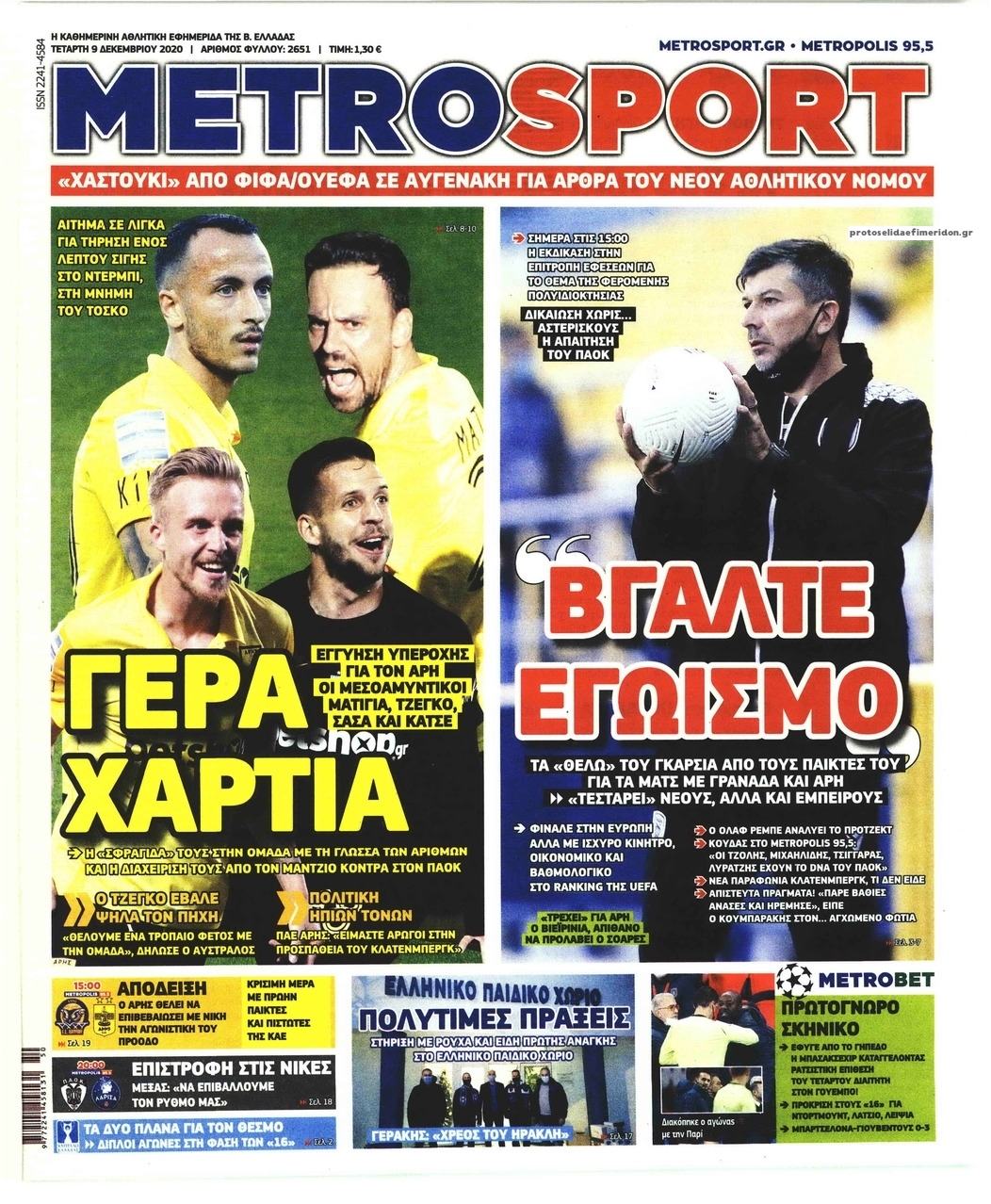 NewsMEDIA Διαβάστε όλα τα πρωτοσέλιδα των αθλητικών εφημερίδων της Τετάρτης 9 Δεκεμβρίου 2020 FacebookXEmailViberWhatsAppCopy URLΤυπώνω Διαβάστε όλα τα πρωτοσέλιδα των αθλητικών εφημερίδων της Τετάρτης 9 Δεκεμβρίου. Πλήρης ενημέρωση με μια γρήγορη ματιά!