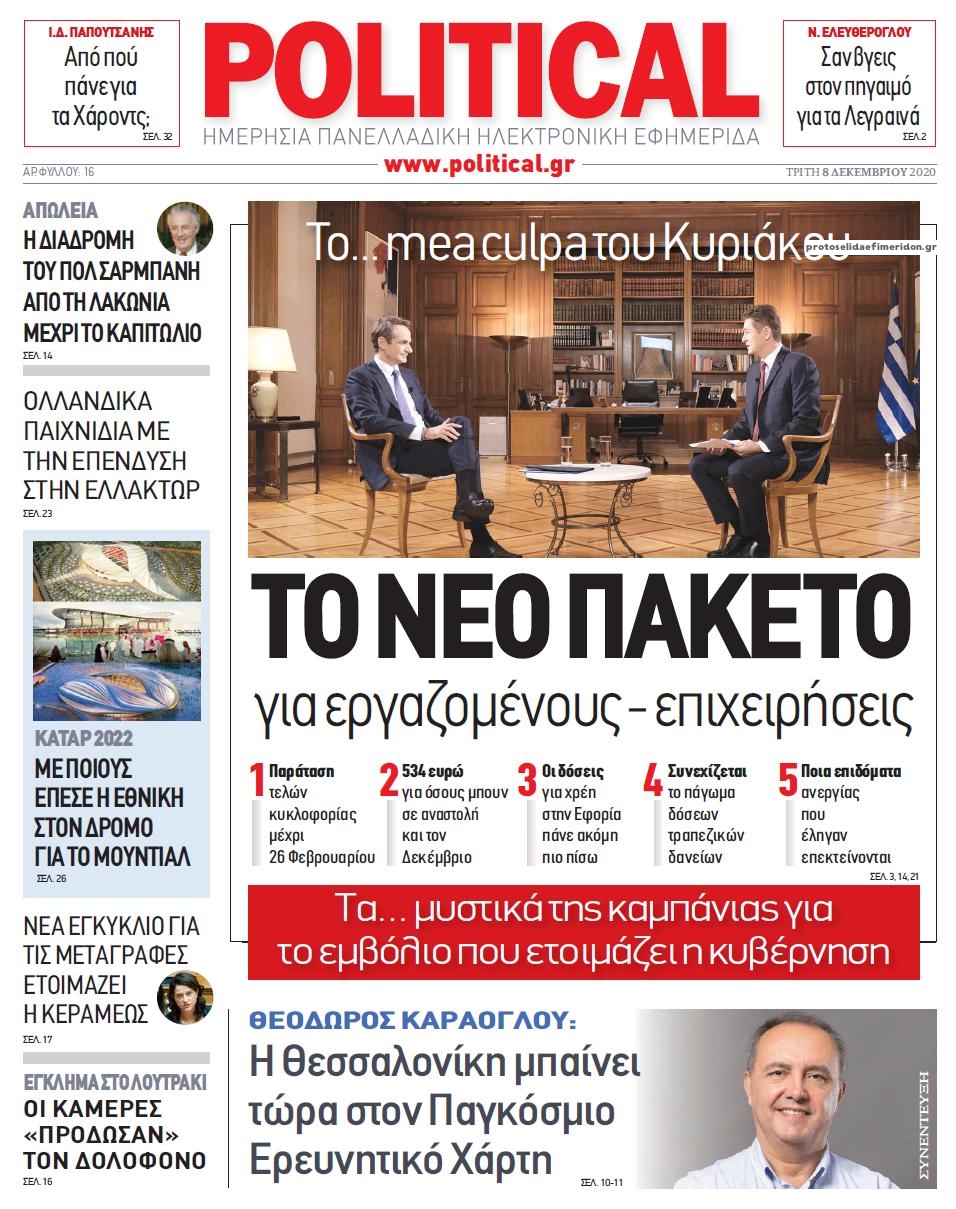NewsMEDIASLIDER Διαβάστε όλα τα πρωτοσέλιδα των πολιτικών εφημερίδων της Τρίτης 8 Δεκεμβρίου 2020 FacebookTwitterEmailViberWhatsAppCopy URLΤυπώνω Διαβάστε όλα τα πρωτοσέλιδα των πολιτικών εφημερίδων της Τρίτης 8ης Δεκεμβρίου. Πλήρης ενημέρωση με μια γρήγορη ματιά!
