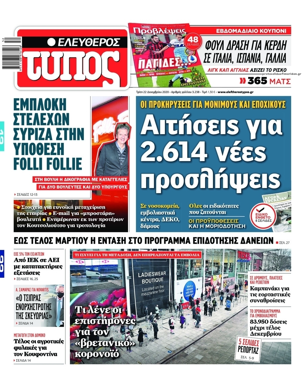 NewsMEDIASLIDER Διαβάστε όλα τα πρωτοσέλιδα των πολιτικών εφημερίδων της Τρίτης 22 Δεκεμβρίου 2020 FacebookTwitterEmailViberWhatsAppCopy URLΤυπώνω Διαβάστε όλα τα πρωτοσέλιδα των πολιτικών εφημερίδων της Τρίτης 22 Δεκεμβρίου. Πλήρης ενημέρωση με μια γρήγορη ματιά!