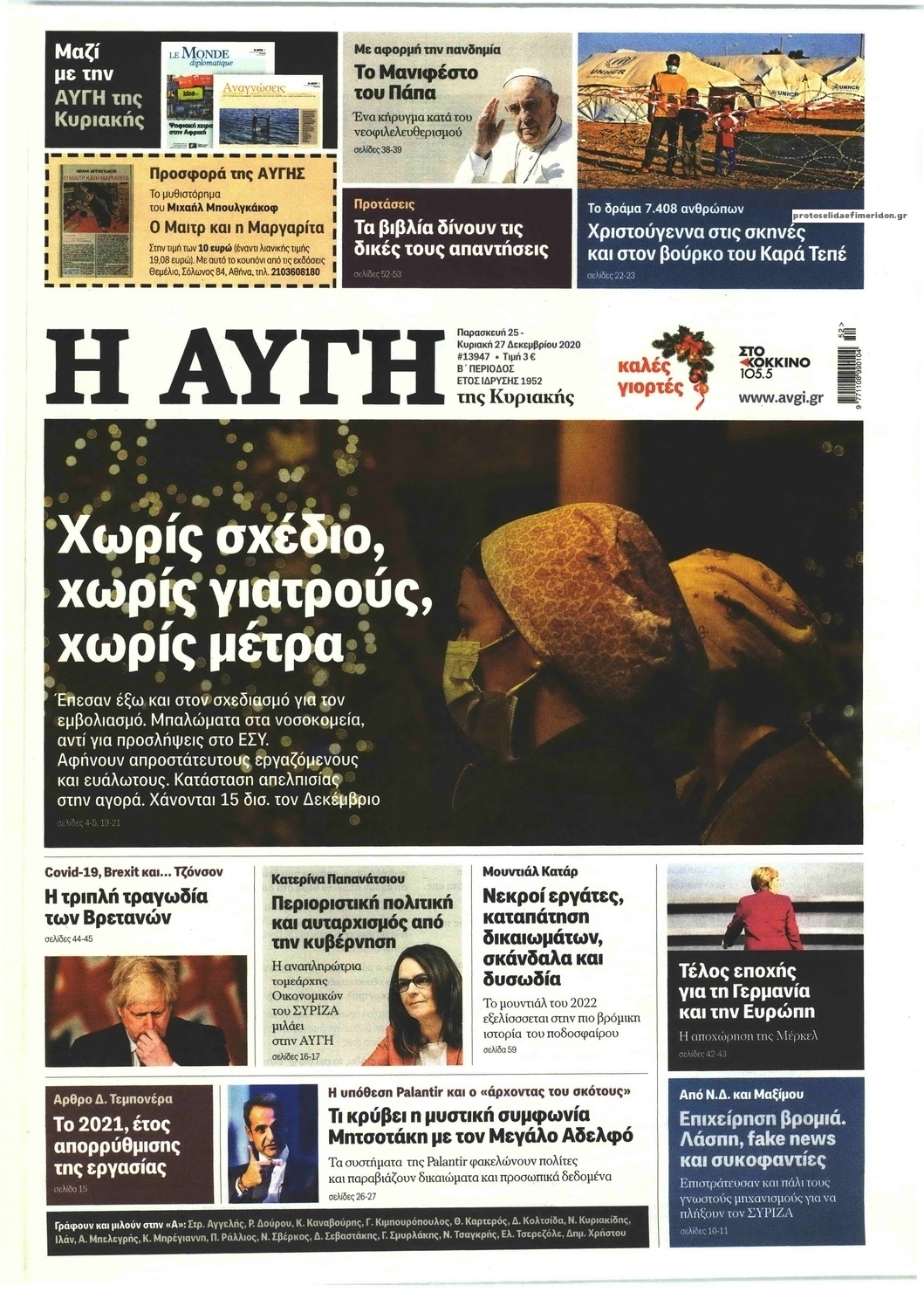 NewsMEDIA Διαβάστε όλα τα πρωτοσέλιδα των πολιτικών εφημερίδων τoυ Σαββατοκύριακου 27 Δεκεμβρίου 2020 FacebookXEmailViberWhatsAppCopy URLΤυπώνω Διαβάστε όλα τα πρωτοσέλιδα των πολιτικών εφημερίδων του Σαββάτου 26 και της Κυριακής 27 Δεκεμβρίου. Πλήρης ενημέρωση με μια γρήγορη ματιά!