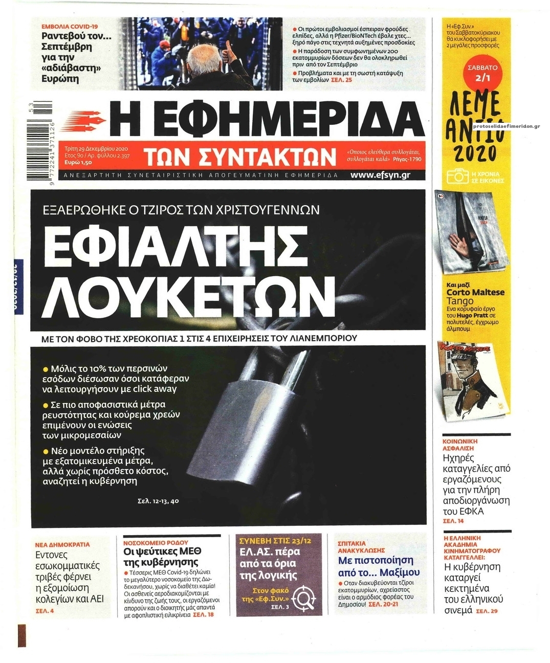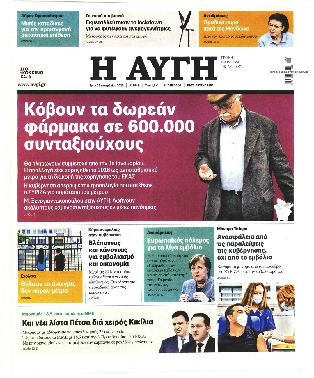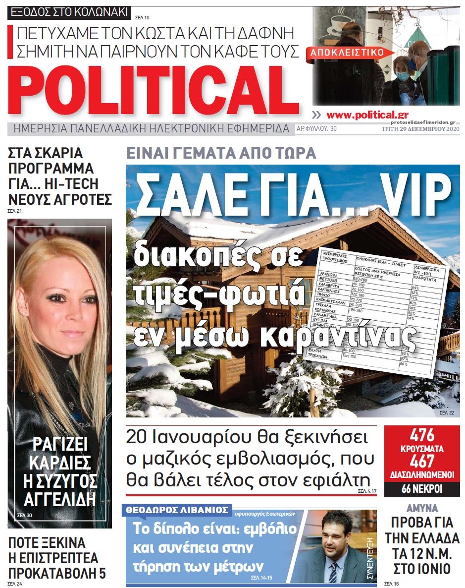 NewsMEDIA Διαβάστε όλα τα πρωτοσέλιδα των πολιτικών εφημερίδων της Τρίτης 29 Δεκεμβρίου 2020 FacebookTwitterEmailViberWhatsAppCopy URLΤυπώνω Διαβάστε όλα τα πρωτοσέλιδα των πολιτικών εφημερίδων της Τρίτης 29 Δεκεμβρίου. Πλήρης ενημέρωση με μια γρήγορη ματιά!