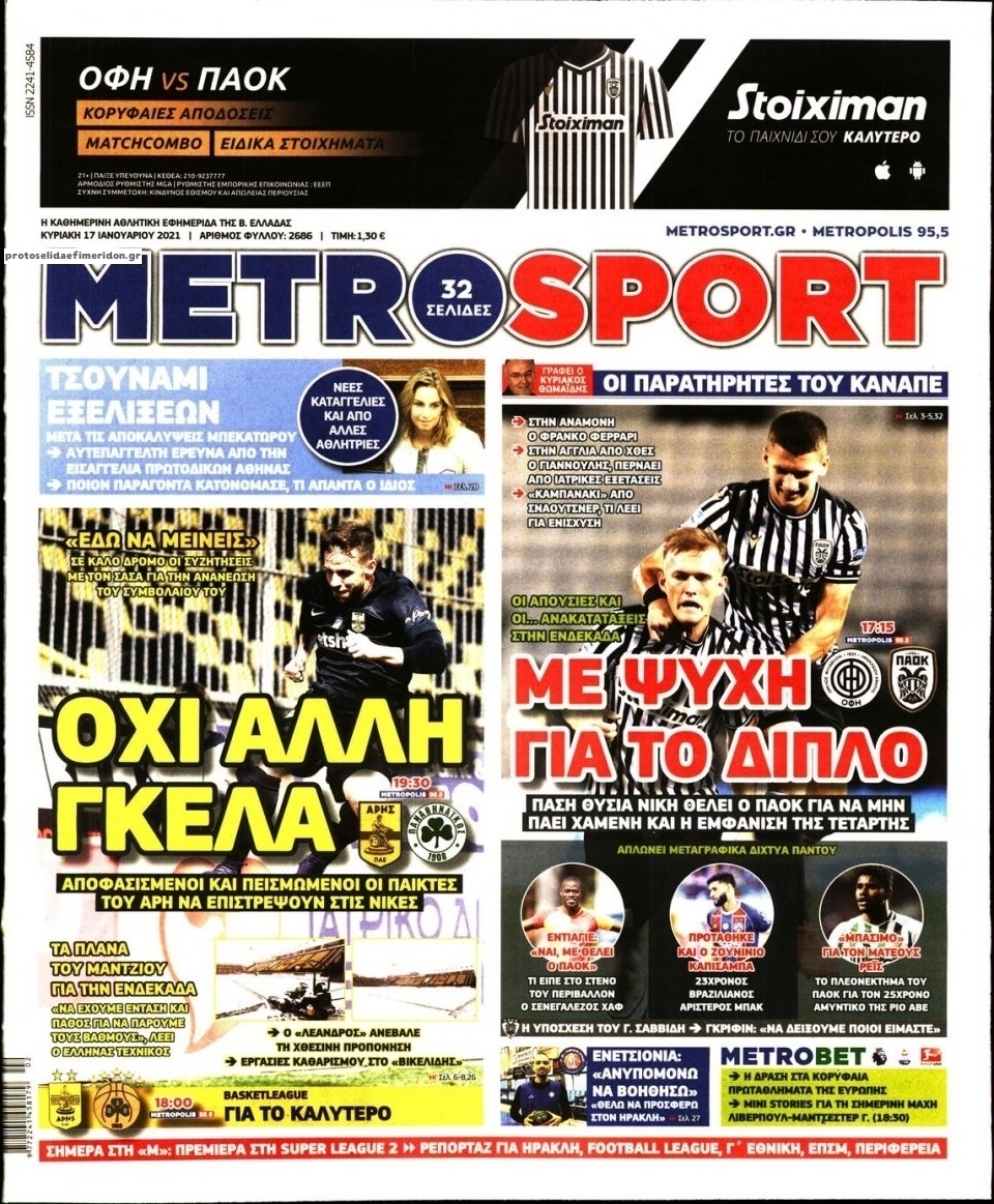 NewsMEDIA Διαβάστε όλα τα πρωτοσέλιδα των αθλητικών εφημερίδων της Κυριακής 17 Ιανουαρίου 2021 FacebookTwitterEmailViberWhatsAppCopy URLΤυπώνω Διαβάστε όλα τα πρωτοσέλιδα των αθλητικών εφημερίδων της Κυριακής 17 Ιανουαρίου. Πλήρης ενημέρωση με μια γρήγορη ματιά!