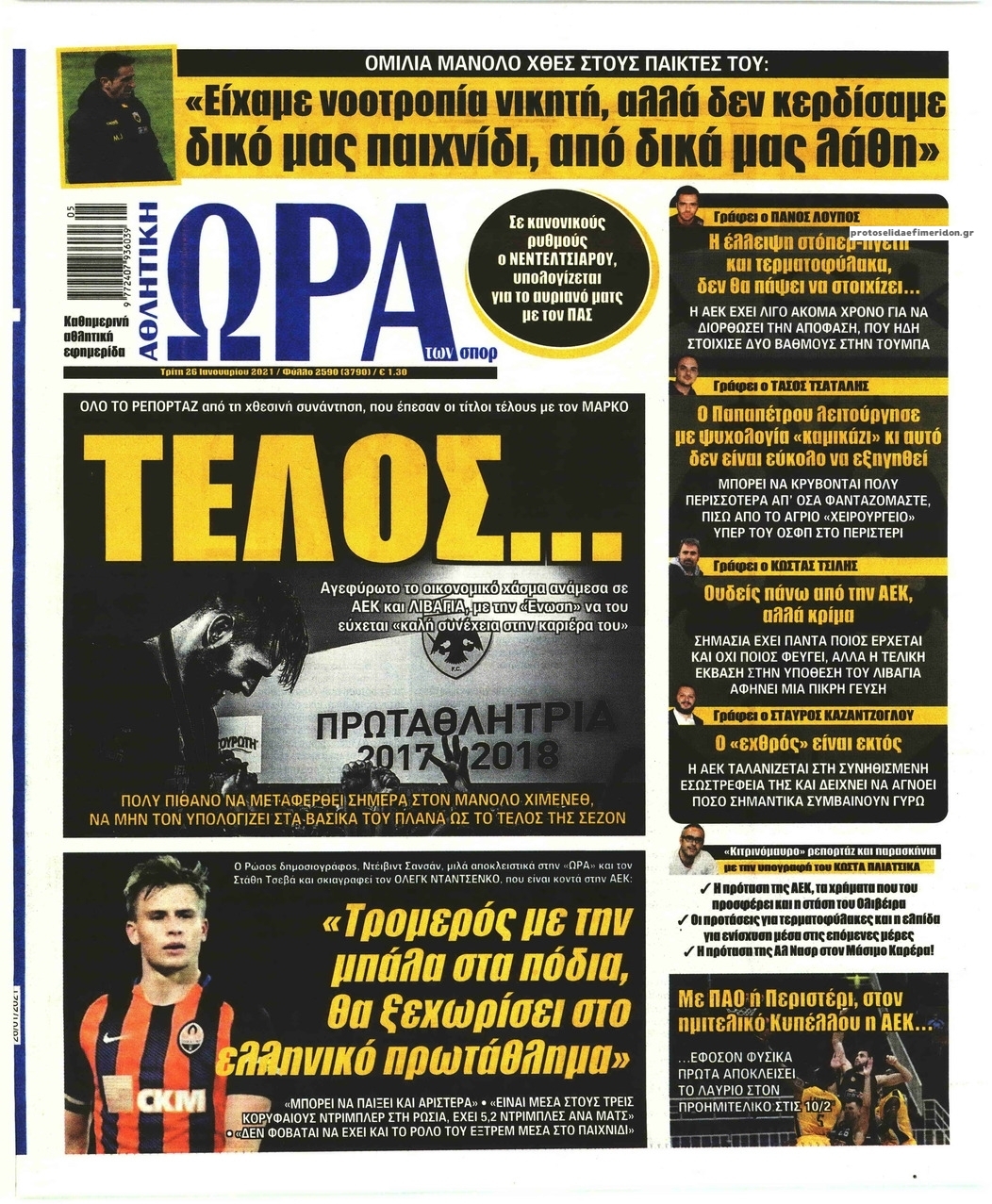 NewsMEDIA Διαβάστε όλα τα πρωτοσέλιδα των αθλητικών εφημερίδων της Τρίτης 26 Ιανουαρίου 2021 FacebookTwitterEmailViberWhatsAppCopy URLΤυπώνω Διαβάστε όλα τα πρωτοσέλιδα των αθλητικών εφημερίδων της Τρίτης 26 Ιανουαρίου. Πλήρης ενημέρωση με μια γρήγορη ματιά!