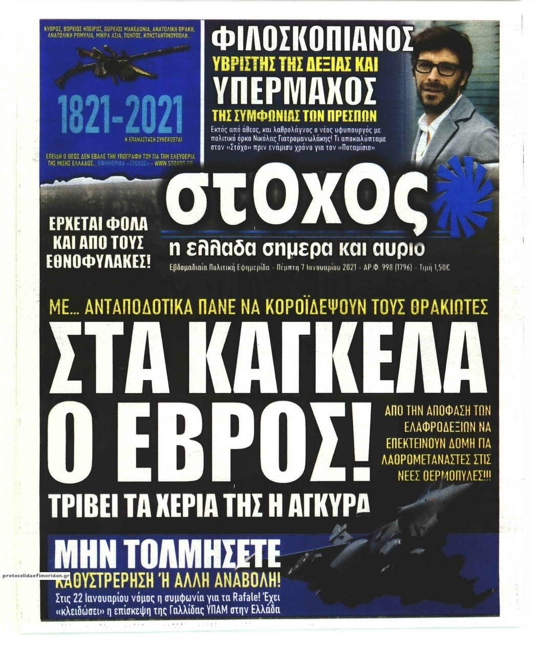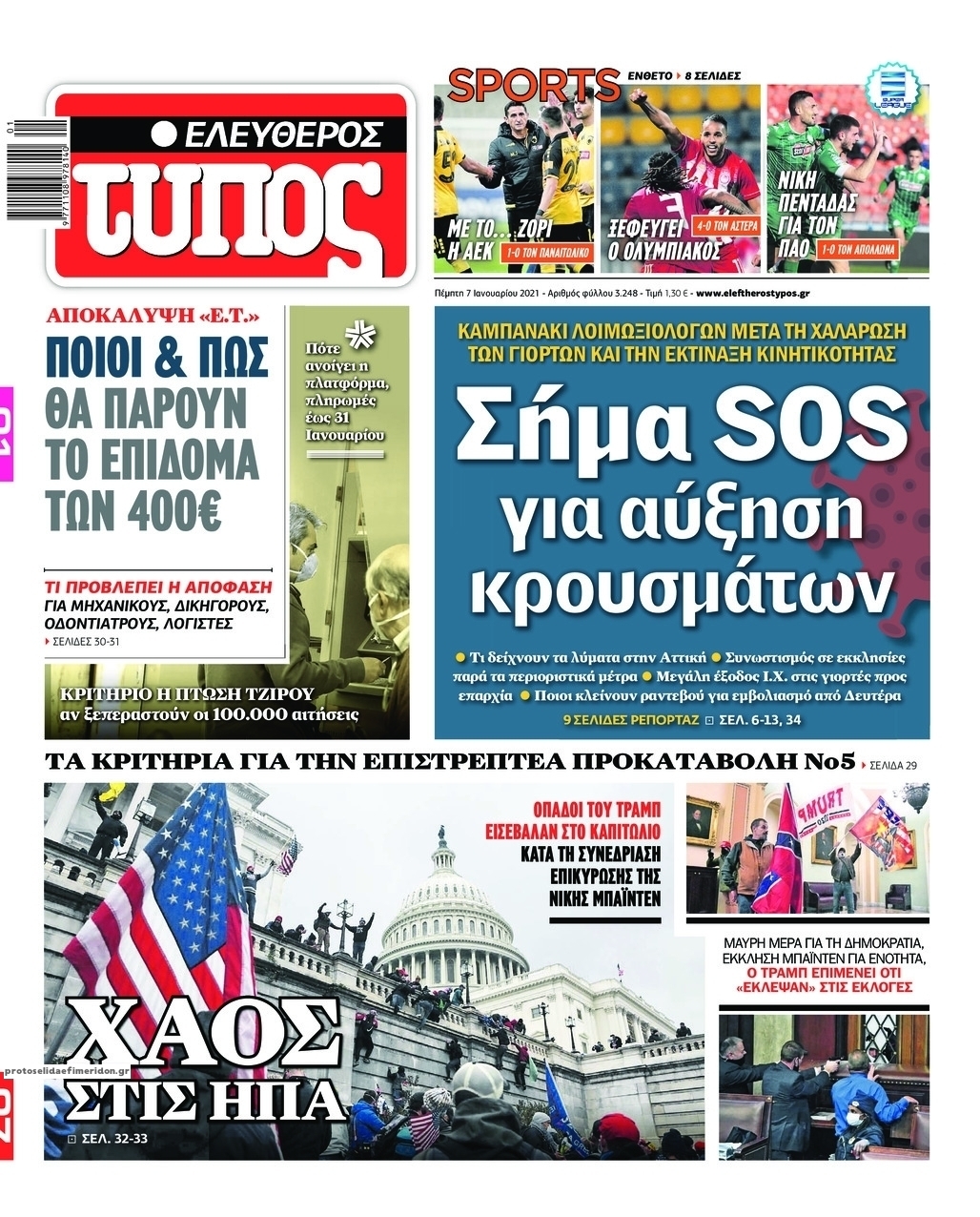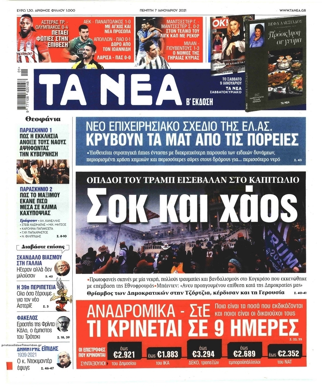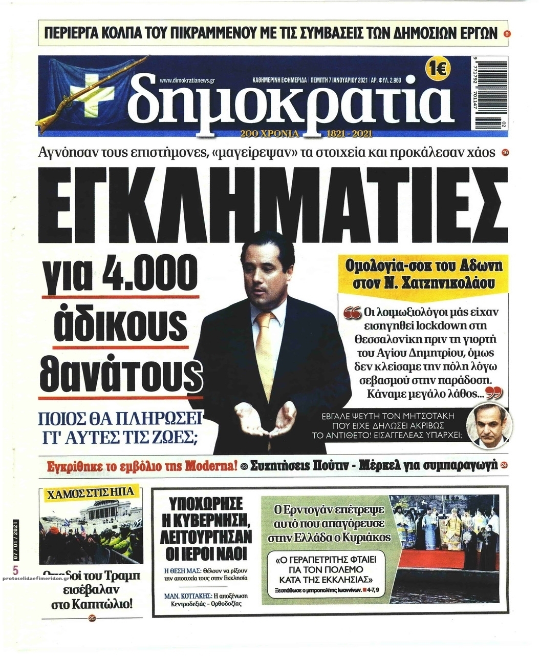 NewsMEDIASLIDER Διαβάστε όλα τα πρωτοσέλιδα των πολιτικών εφημερίδων της Πέμπτης 7 Ιανουαρίου 2021 FacebookTwitterEmailViberWhatsAppCopy URLΤυπώνω Διαβάστε όλα τα πρωτοσέλιδα των πολιτικών εφημερίδων της Πέμπτης 7 Ιανουαρίου. Πλήρης ενημέρωση με μια γρήγορη ματιά!