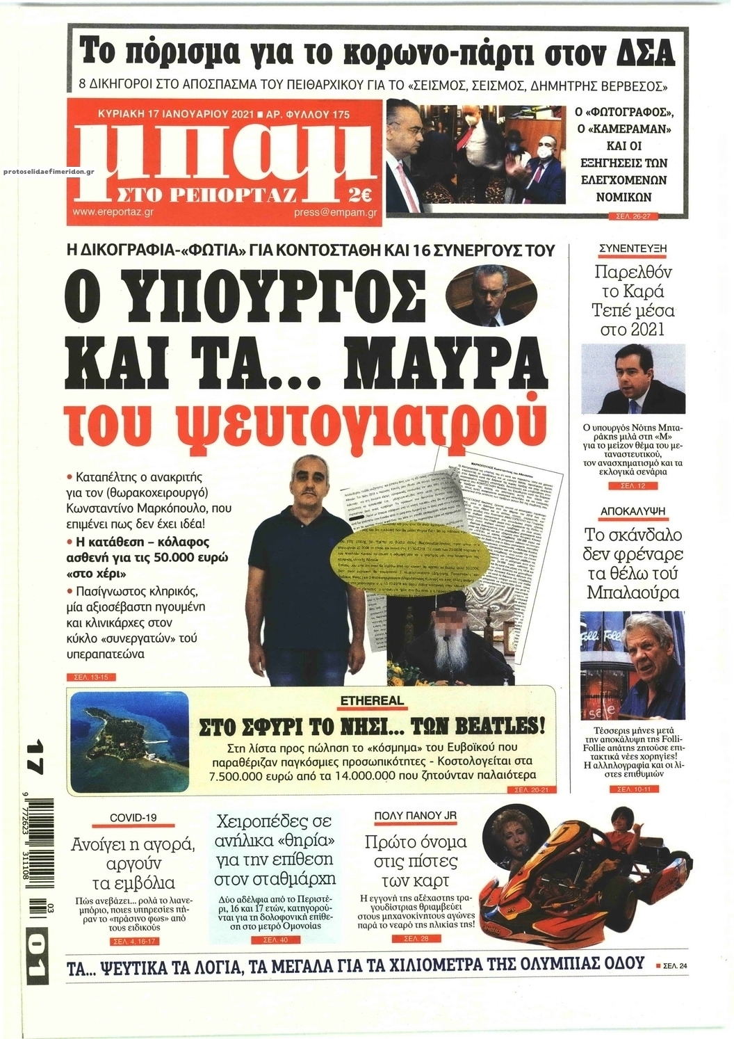 NewsMEDIASLIDER Διαβάστε όλα τα πρωτοσέλιδα των πολιτικών εφημερίδων της Κυριακής 17 Ιανουαρίου 2021 FacebookXEmailViberWhatsAppCopy URLΤυπώνω Διαβάστε όλα τα πρωτοσέλιδα των πολιτικών εφημερίδων της Κυριακής 17 Ιανουαρίου. Πλήρης ενημέρωση με μια γρήγορη ματιά!