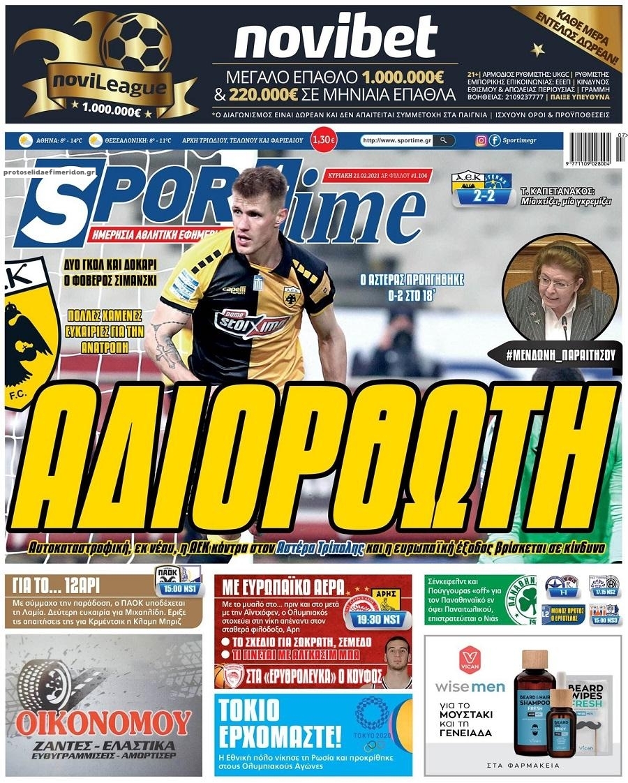 NewsMEDIA Διαβάστε όλα τα πρωτοσέλιδα των αθληιτικών εφημερίδων της Κυριακής 21 Φεβρουαρίου 2021 FacebookTwitterEmailViberWhatsAppCopy URLΤυπώνω Διαβάστε όλα τα πρωτοσέλιδα των αθληιτικών εφημερίδων της Κυριακής 21 Φεβρουαρίου. Πλήρης ενημέρωση με μια γρήγορη ματιά!