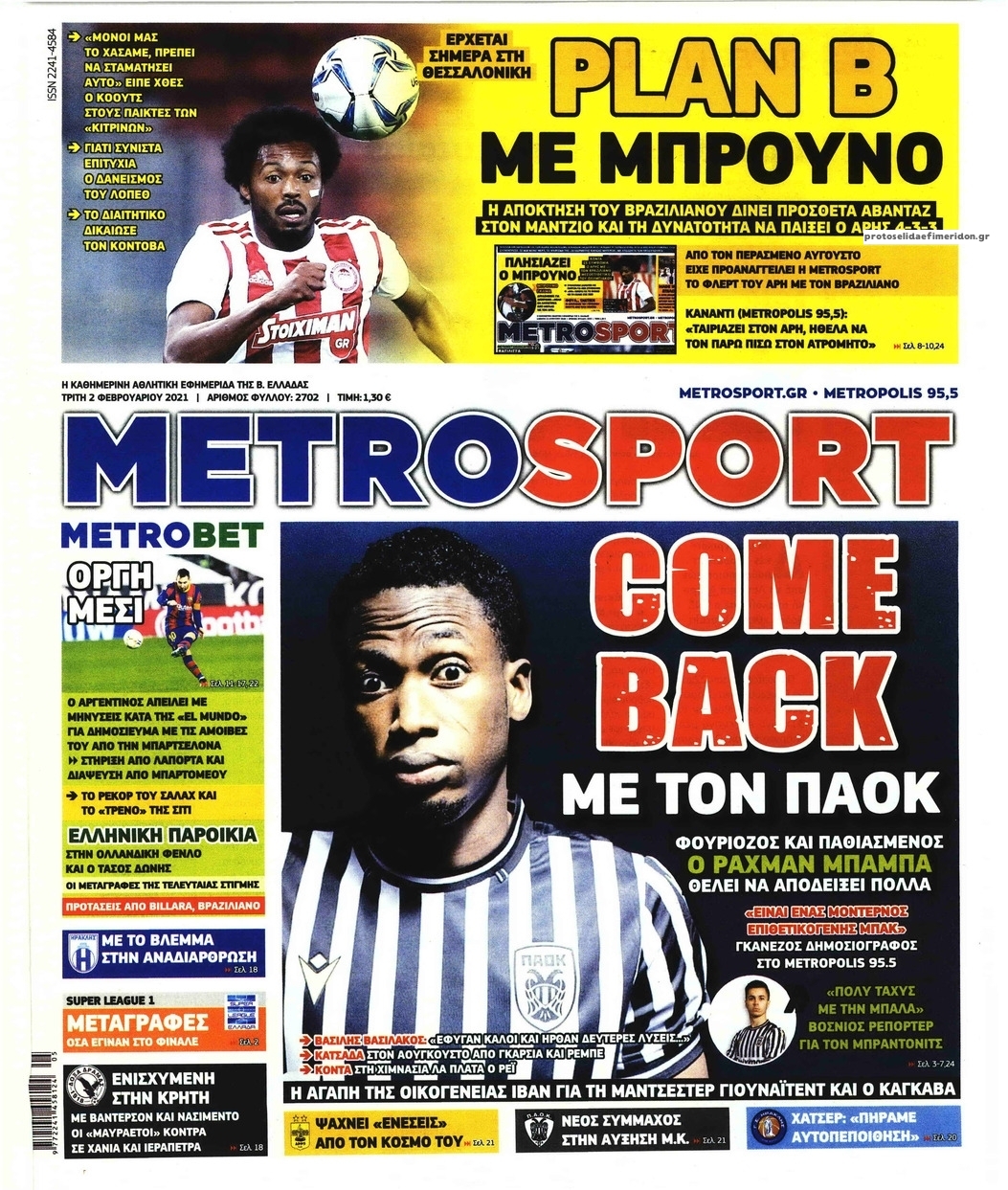 NewsMEDIA Διαβάστε όλα τα πρωτοσέλιδα των αθλητικών εφημερίδων της Τρίτης 2 Φεβρουαρίου 2021 FacebookTwitterEmailViberWhatsAppCopy URLΤυπώνω Διαβάστε όλα τα πρωτοσέλιδα των αθλητικών εφημερίδων της Τρίτης 2 Φεβρουαρίου. Πλήρης ενημέρωση με μια γρήγορη ματιά!