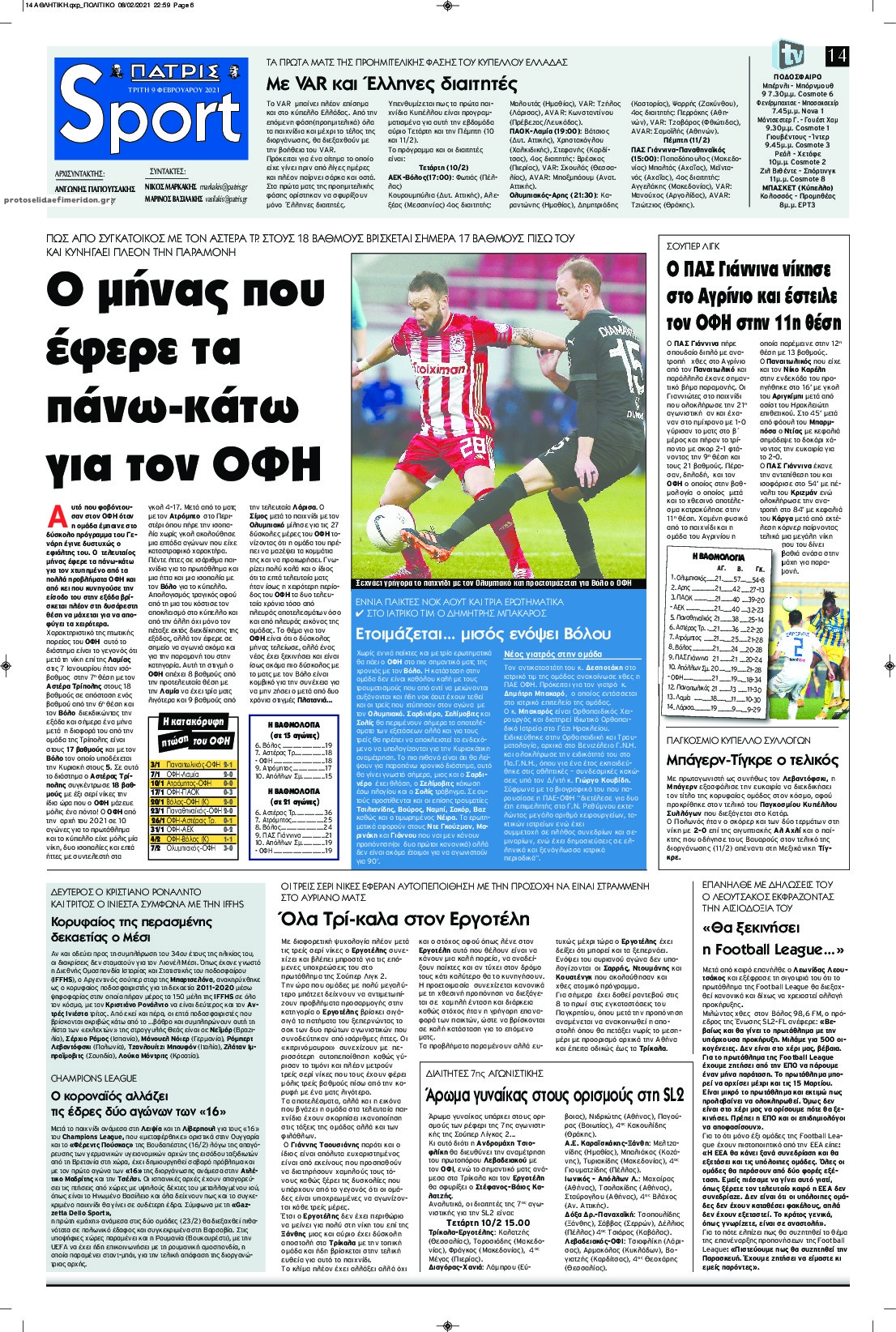 NewsMEDIA Διαβάστε όλα τα πρωτοσέλιδα των αθλητικών εφημερίδων της Τρίτης 9 Φεβρουαρίου 2021 FacebookTwitterEmailViberWhatsAppCopy URLΤυπώνω Διαβάστε όλα τα πρωτοσέλιδα των αθλητικών εφημερίδων της Τρίτης 9 Φεβρουαρίου. Πλήρης ενημέρωση με μια γρήγορη ματιά!