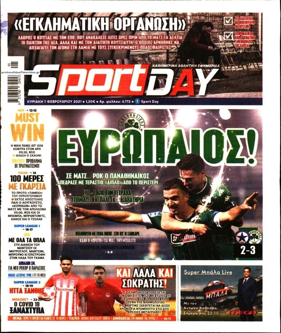 NewsMEDIA Διαβάστε όλα τα πρωτοσέλιδα των αθλητικών εφημερίδων της Κυριακής 7 Φεβρουαρίου 2021 FacebookTwitterEmailViberWhatsAppCopy URLΤυπώνω Διαβάστε όλα τα πρωτοσέλιδα των αθλητικών εφημερίδων της Κυριακής 7 Φεβρουαρίου. Πλήρης ενημέρωση με μια γρήγορη ματιά!