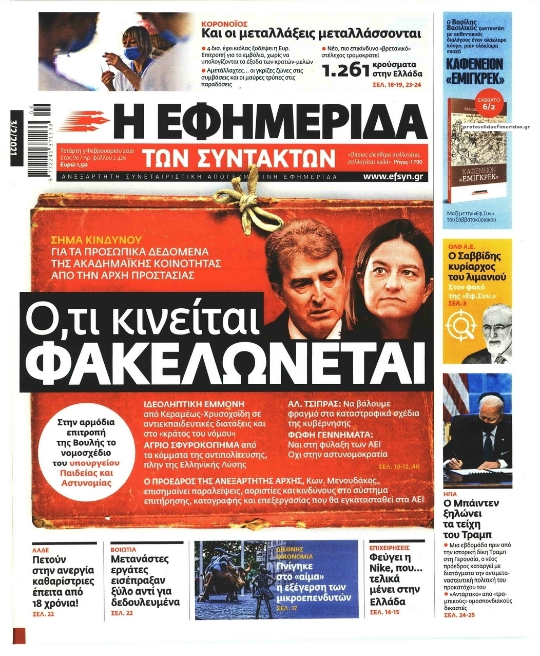 NewsMEDIA Διαβάστε όλα τα πρωτοσέλιδα των πολιτικών εφημερίδων της Τετάρτης 3 Φεβρουαρίου 2021 FacebookTwitterEmailViberWhatsAppCopy URLΤυπώνω Διαβάστε όλα τα πρωτοσέλιδα των πολιτικών εφημερίδων της Τετάρτης 3 Φεβρουαρίου. Πλήρης ενημέρωση με μια γρήγορη ματιά!