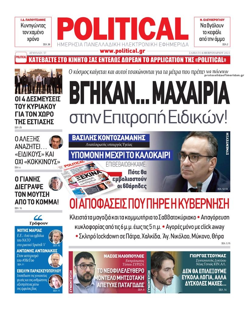 NewsMEDIA Διαβάστε όλα τα πρωτοσέλιδα των πολιτικών εφημερίδων του Σαββάτου 6 Φεβρουαρίου 2021 FacebookXEmailViberWhatsAppCopy URLΤυπώνω Διαβάστε όλα τα πρωτοσέλιδα των πολιτικών εφημερίδων του Σαββάτου 6 Φεβρουαρίου. Πλήρης ενημέρωση με μια γρήγορη ματιά!