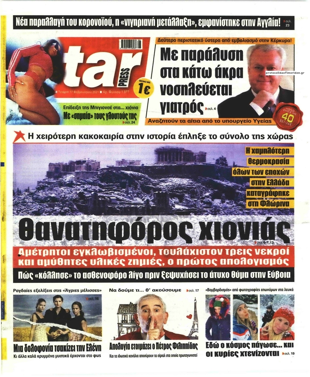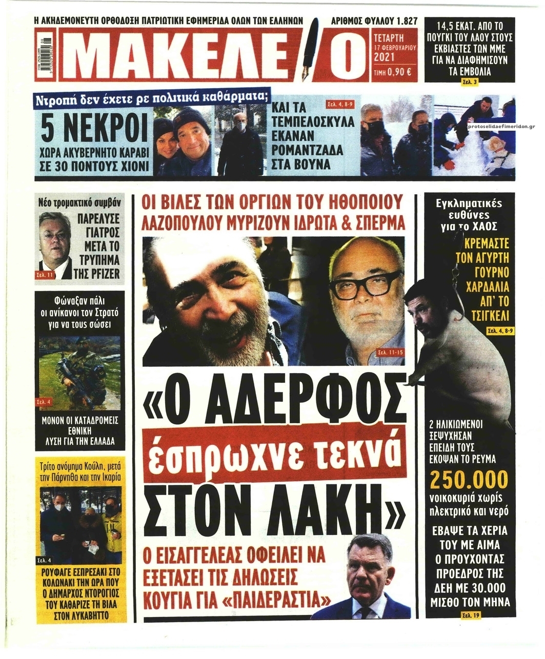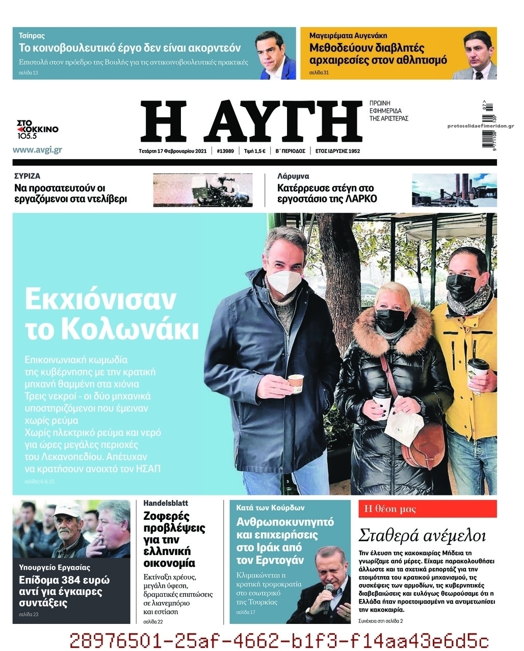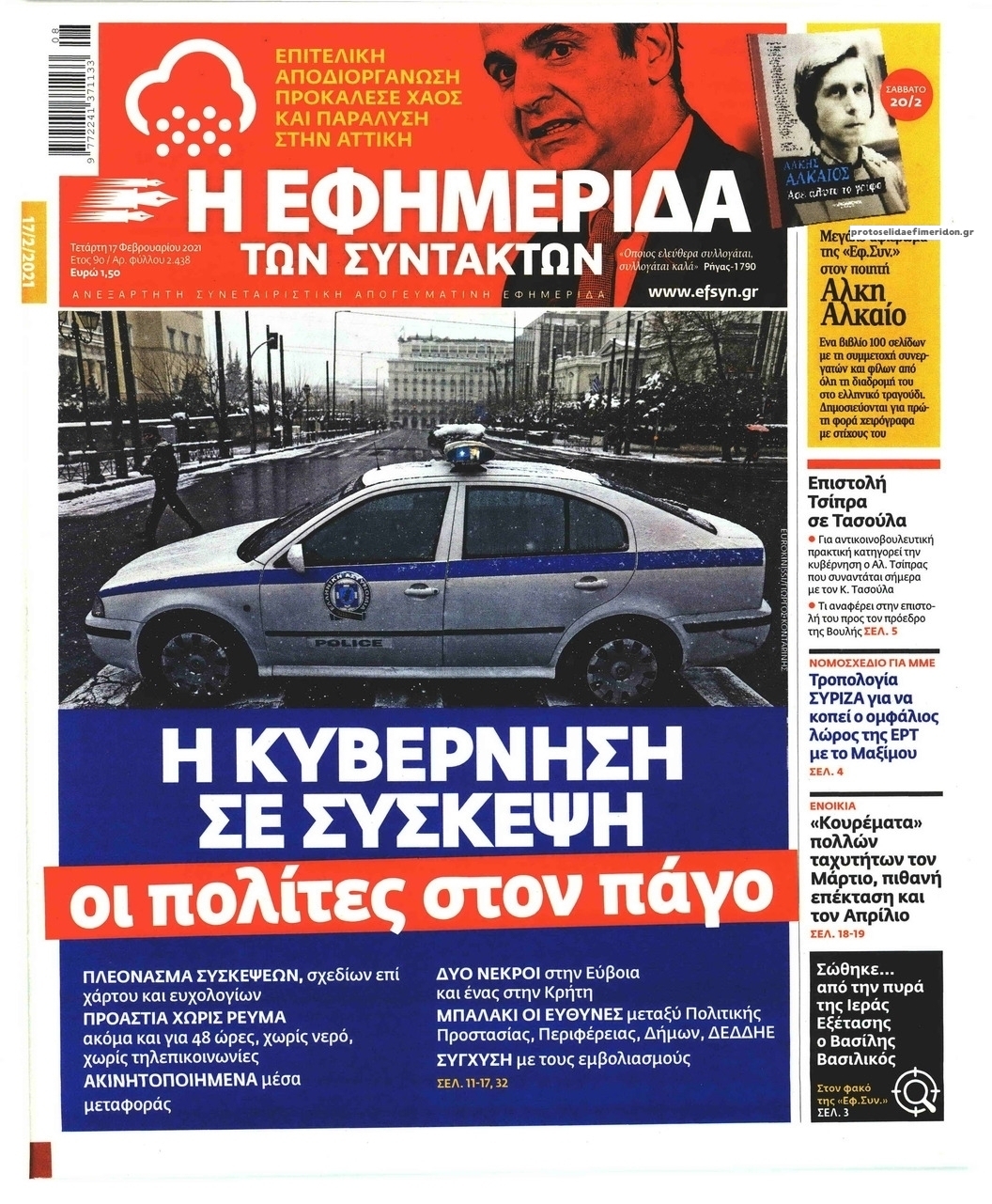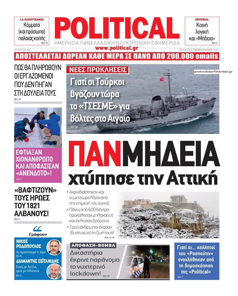 NewsMEDIASLIDER Διαβάστε όλα τα πρωτοσέλιδα των πολιτικών εφημερίδων της Τετάρτης 17 Φεβρουαρίου 2021 FacebookXEmailViberWhatsAppCopy URLΤυπώνω Διαβάστε όλα τα πρωτοσέλιδα των πολιτικών εφημερίδων της Τετάρτης 17 Φεβρουαρίου. Πλήρης ενημέρωση με μια γρήγορη ματιά!