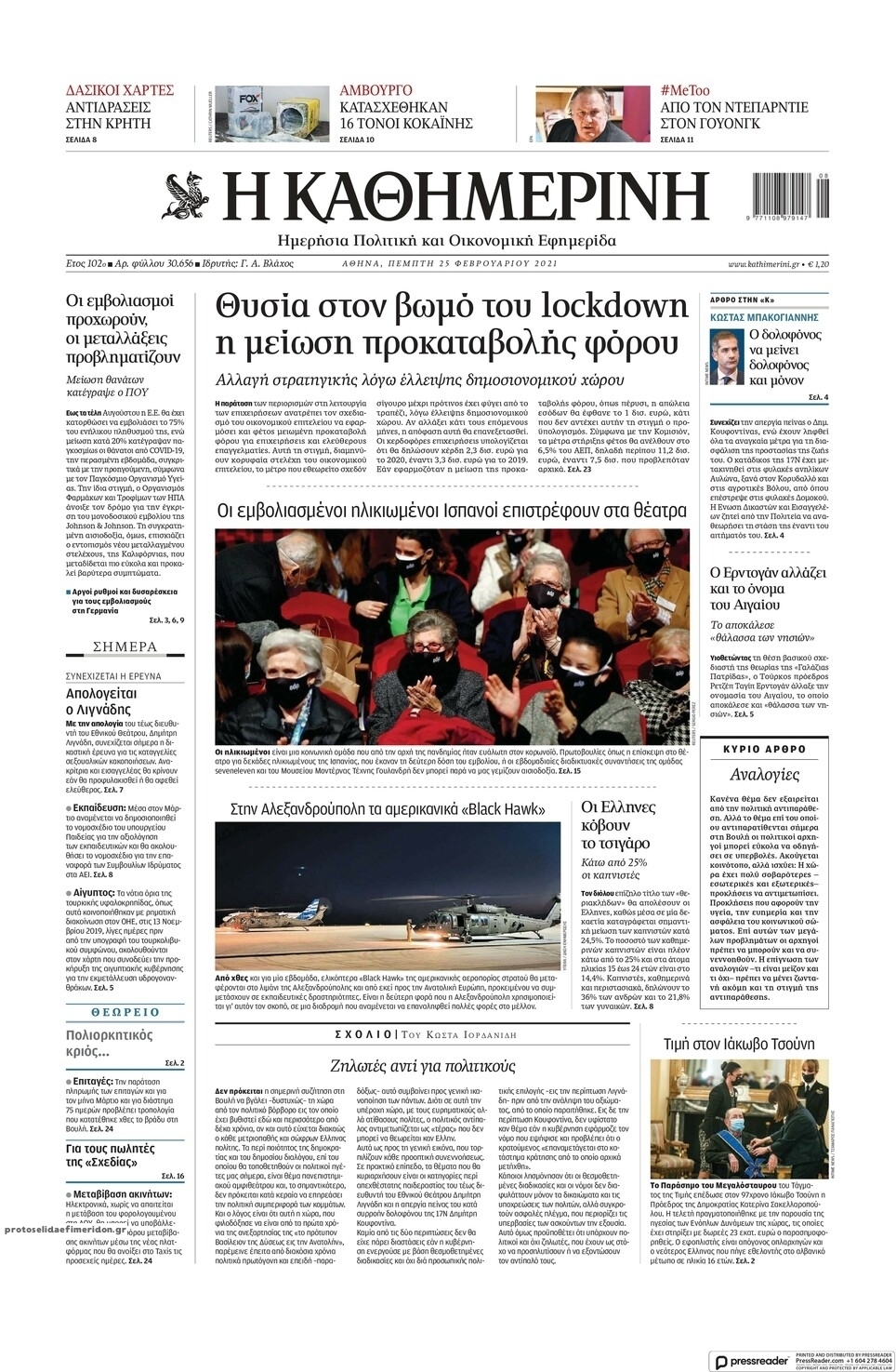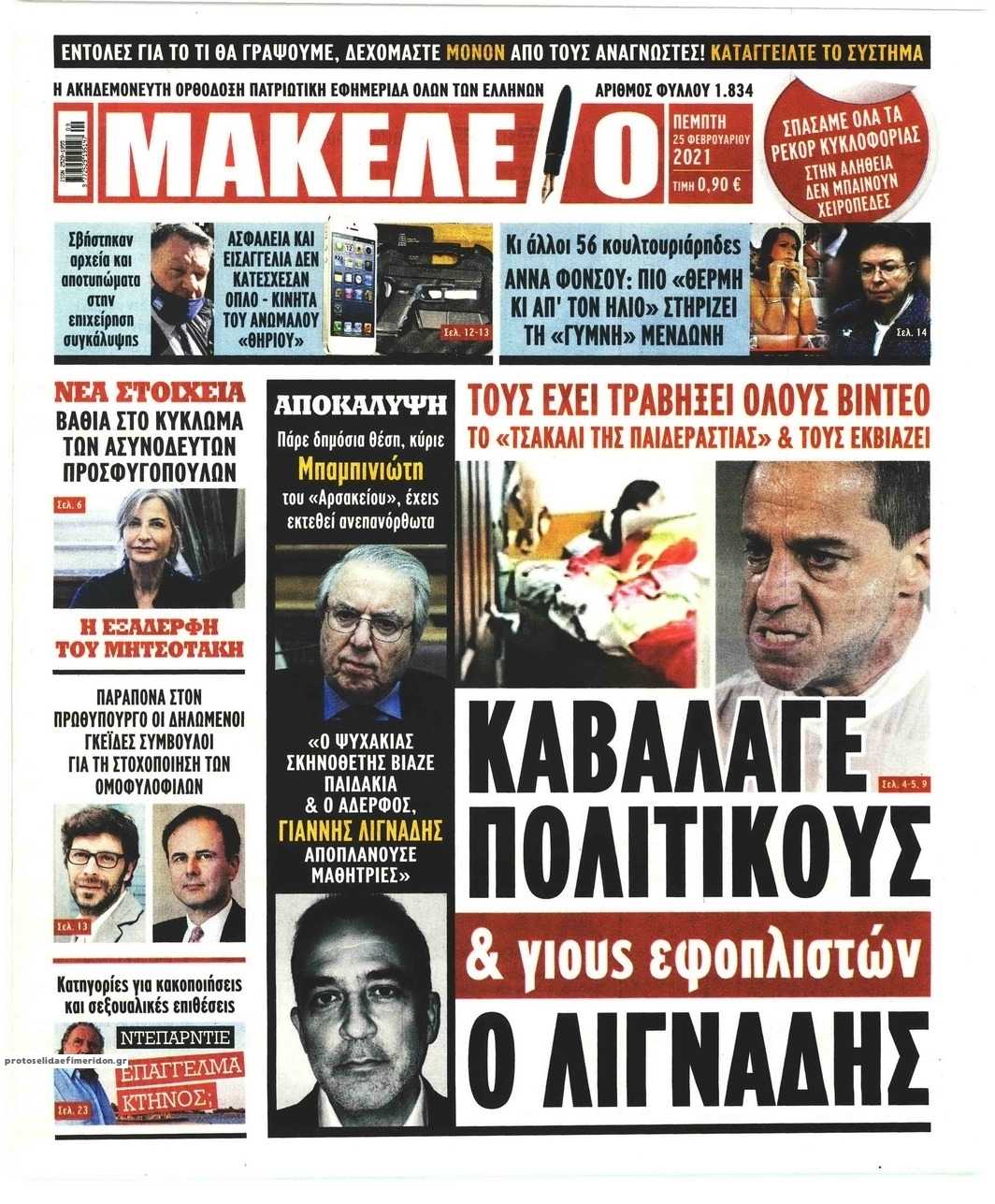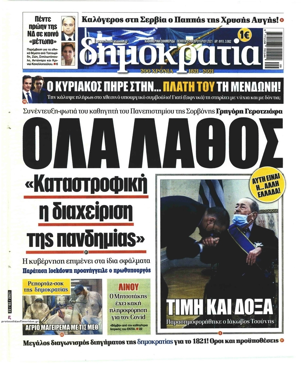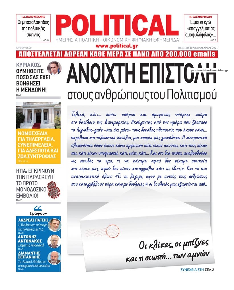 NewsMEDIA Διαβάστε όλα τα πρωτοσέλιδα των πολιτικών εφημερίδων της Πέμπτης 25 Φεβρουαρίου 2021 FacebookTwitterEmailViberWhatsAppCopy URLΤυπώνω Διαβάστε όλα τα πρωτοσέλιδα των πολιτικών εφημερίδων της Πέμπτης 25 Φεβρουαρίου. Πλήρης ενημέρωση με μια γρήγορη ματιά!