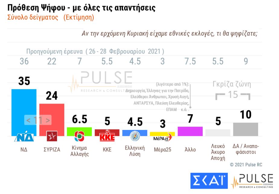 Η έρευνα της Pulse είναι πανελλαδική και έγινε τηλεφωνικά με τη χρήση δομημένου ηλεκτρονικού ερωτηματολογίου σε δείγμα 1.306 ατόμων το διάστημα 26 – 28 Μαρτίου 2021.