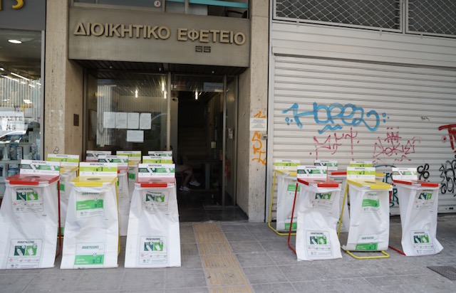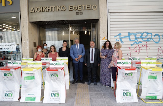 Τους ειδικούς κάδους εσωτερικής ανακύκλωσης και χωριστής συλλογής πλαστικών, μεταλλικών και χάρτινων συσκευασιών διαλογής στην πηγή παρέλαβε ο Πρόεδρος του Διοικητικού Εφετείου Πειραιά Γ. Καφές, συνοδευόμενος από τον Β. Γιάνναρο (Διοικ. Γραμματέα Β/ΠΕ) και την Μ. Μαραγκουδάκη (Διοικ. Γραμματέα). Τον Περιφερειάρχη Αττικής συνόδευσε η Αντιπεριφερειάρχης Πειραιά Στ. Αντωνάκου.