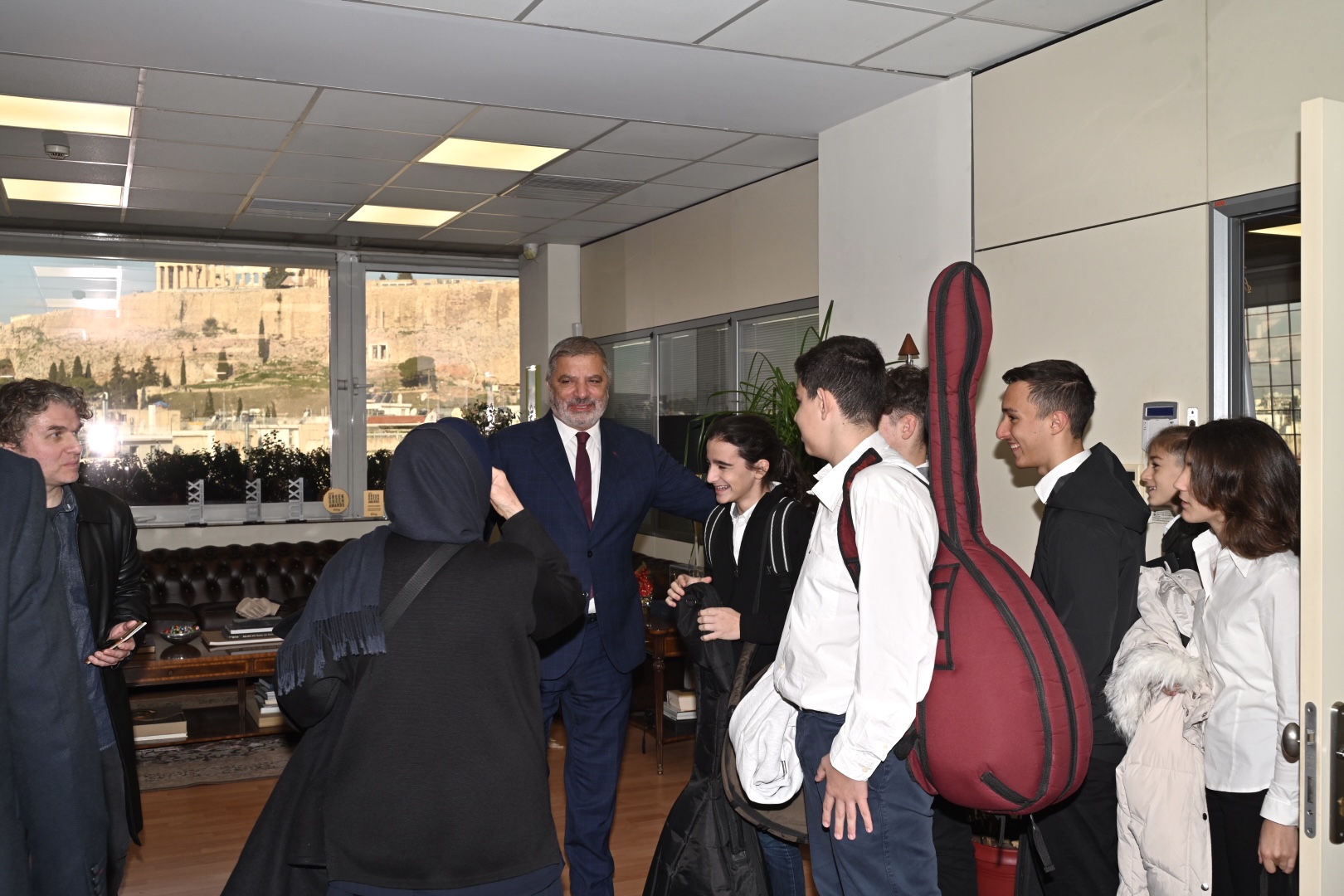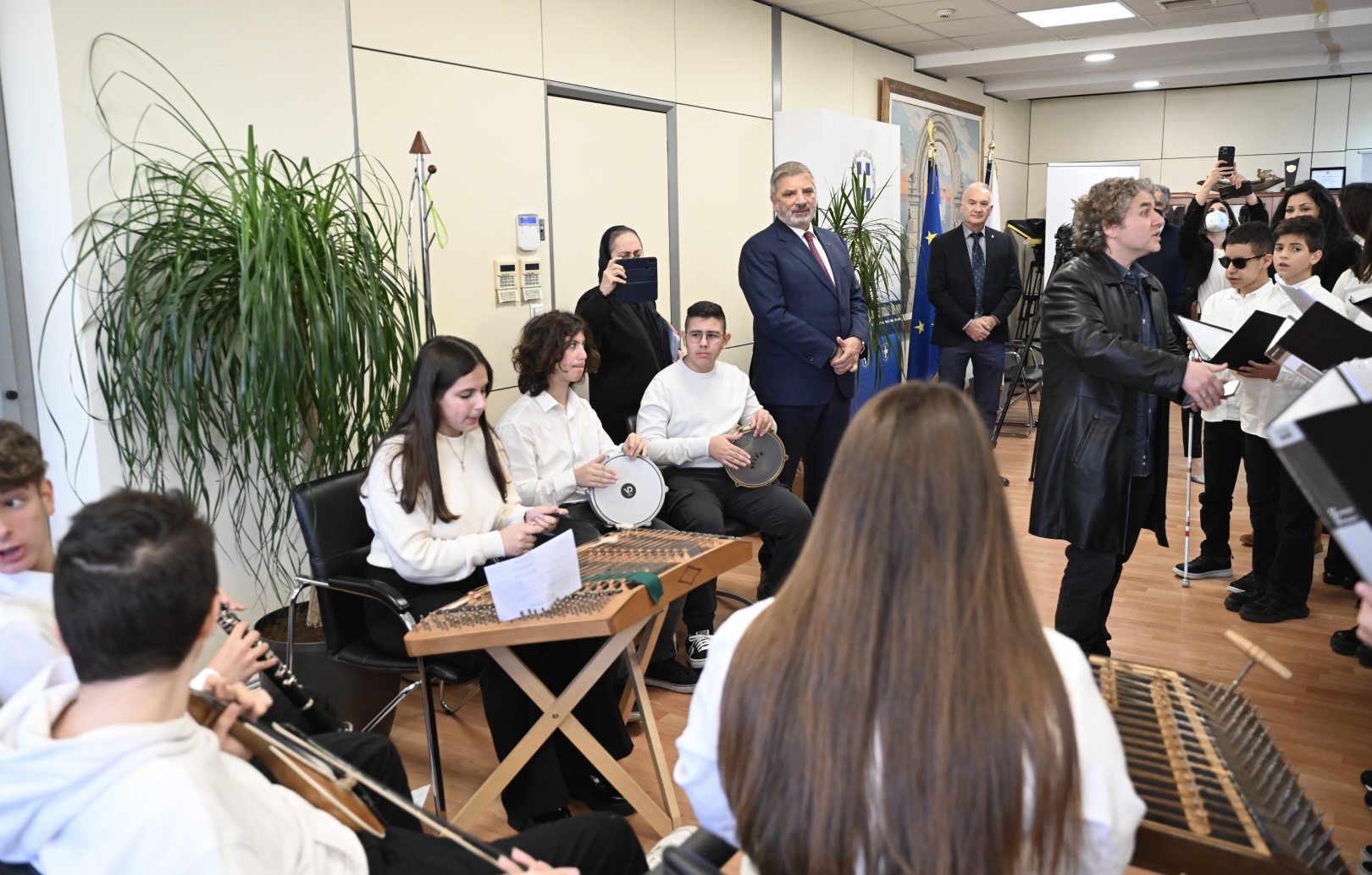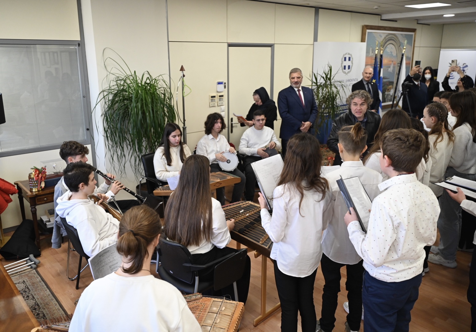 Πλημμύρισε με μουσικές και μελωδίες το γραφείο του Περιφερειάρχη Αττικής Γ. Πατούλη. Μαθητές και καθηγητές των Μουσικών Σχολείων Αθήνας και Αλίμου ευχήθηκαν χρόνια πολλά στον κ. Πατούλη με τη συνοδεία μουσικών οργάνων και της χορωδίας τους.