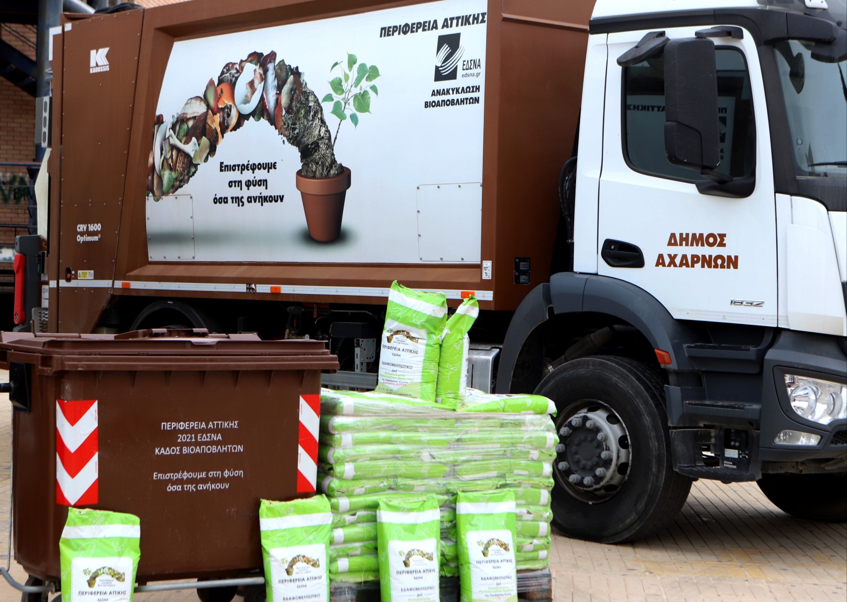 Με 3 σύγχρονα απορριμματοφόρα για τη συλλογή βιοαποβλήτων και 1.400 καφέ κάδους, ενισχύθηκε ο Δήμος Αχαρνών από την Περιφέρεια Αττικής. Ο εξοπλισμός ανακύκλωσης διανέμεται στους δήμους της Αττικής με κονδύλια που αντλεί η Περιφέρεια από ευρωπαϊκά κυρίως προγράμματα χωρίς καμία επιβάρυνση για τους δήμους και τους πολίτες.