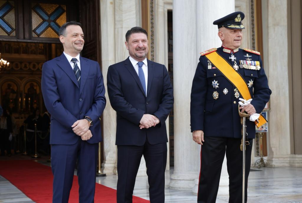 Ο Περιφερειάρχης Αττικής Νίκος Χαρδαλιάς υποδέχθηκε στην είσοδο της Μητρόπολης την Πρόεδρο της Δημοκρατίας Κατερίνα Σακελλαροπούλου, τον Πρωθυπουργό Κυριάκο Μητσοτάκη και τον Πρόεδρο της Βουλής Κωνσταντίνο Τασούλα, μαζί με τον Πρωτοσύγκελο της Αρχιεπισκοπής Αθηνών π. Βαρνάβα Θεοχάρη, τον Δήμαρχο Αθηναίων Χάρη Δούκα και τον Αρχηγό ΓΕΕΘΑ Στρατηγό Κωνσταντίνο Φλώρο, ενώ στρατιωτικό άγημα απέδιδε τιμές.