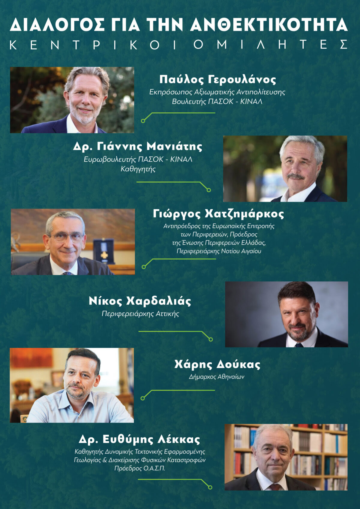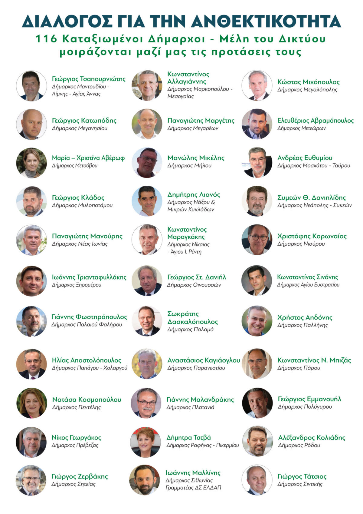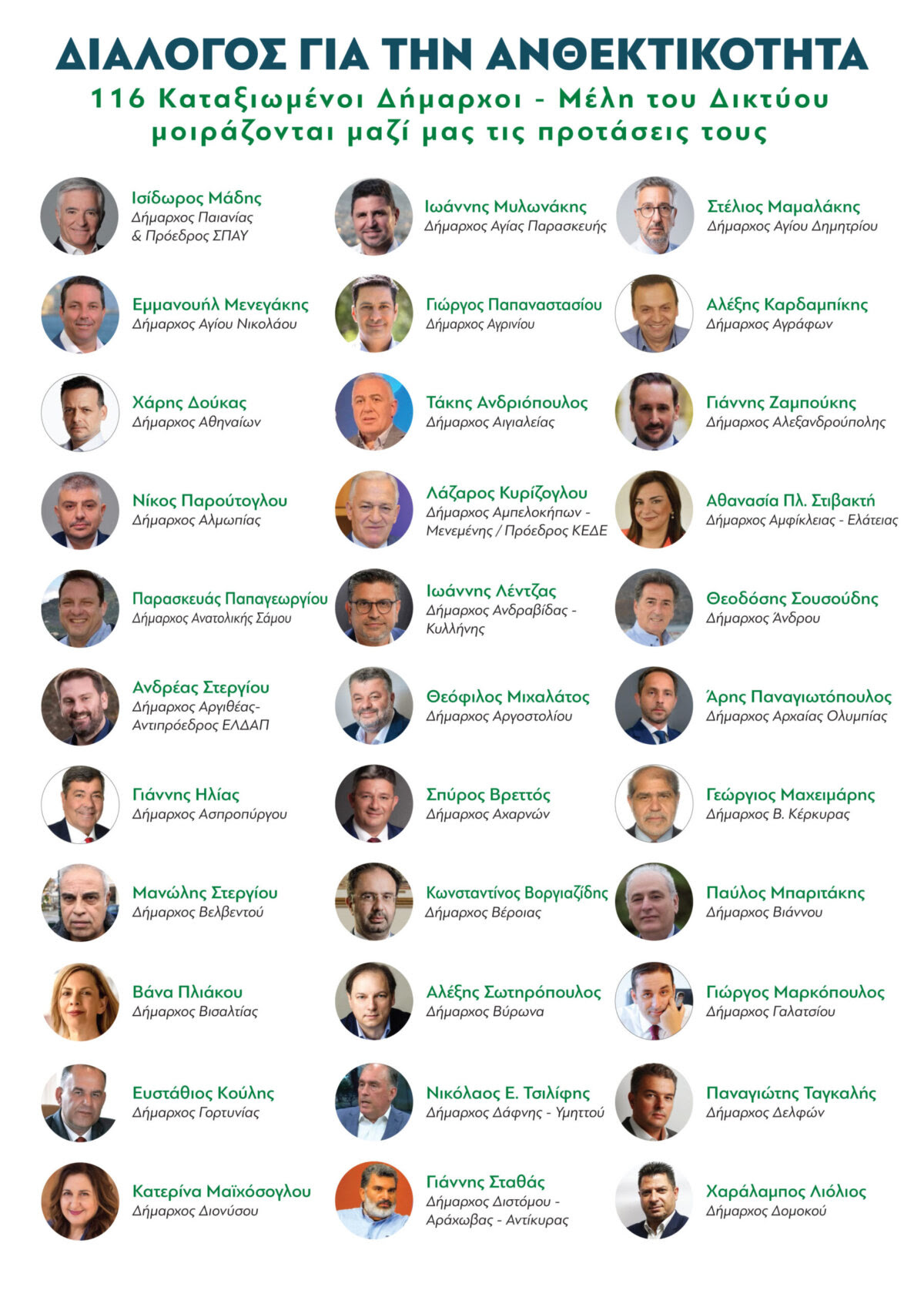 Εκ μέρους του Διοικητικού Συμβουλίου και όλων των Δήμων – Μελών του Ελληνικού Δικτύου Ανθεκτικών Πόλεων, ο Πρόεδρος του Δικτύου και Δήμαρχος Ελληνικού Αργυρούπολης Γιάννης Κωνσταντάτος σας προσκαλεί στον διάλογο τονίζοντας ότι: «Πατριωτικό μας καθήκον είναι να ενωθούμε όλοι οι Δήμοι της χώρας με σκοπό να προστατεύσουμε ανθρώπινες ζωές, δάση και περιουσίες. Όλοι όσοι συμμετέχουμε στο Δίκτυο – μικροί, μεσαίοι και μεγάλοι Δήμοι – όλοι ίσοι απέναντι στις κοινές προκλήσεις δημιουργούμε έναν μεγάλο αυτοδιοικητικό βραχίονα για την πρόληψη σε τοπικό επίπεδο και κυρίως για την ανθεκτικότητα των Δήμων μας σε συνεργασία με τα συναρμόδια υπουργεία και την εκάστοτε κυβέρνηση. Σε αυτή την προσπάθεια δεν περισσεύει κανείς».